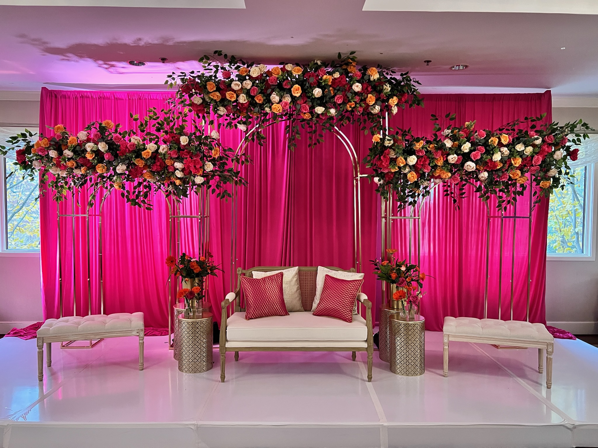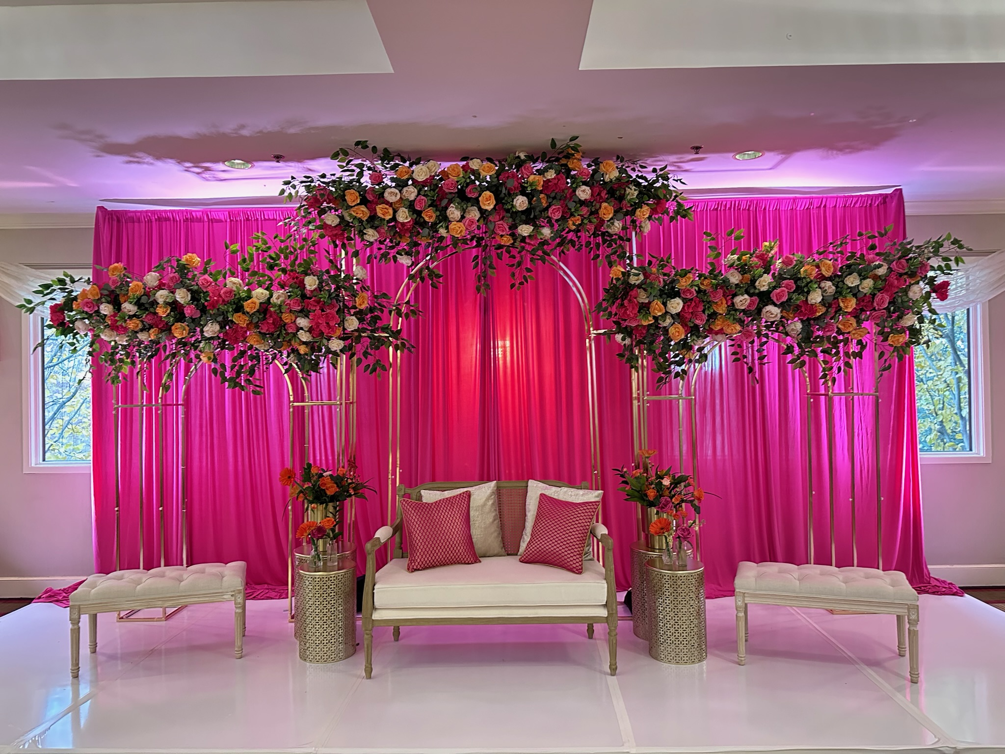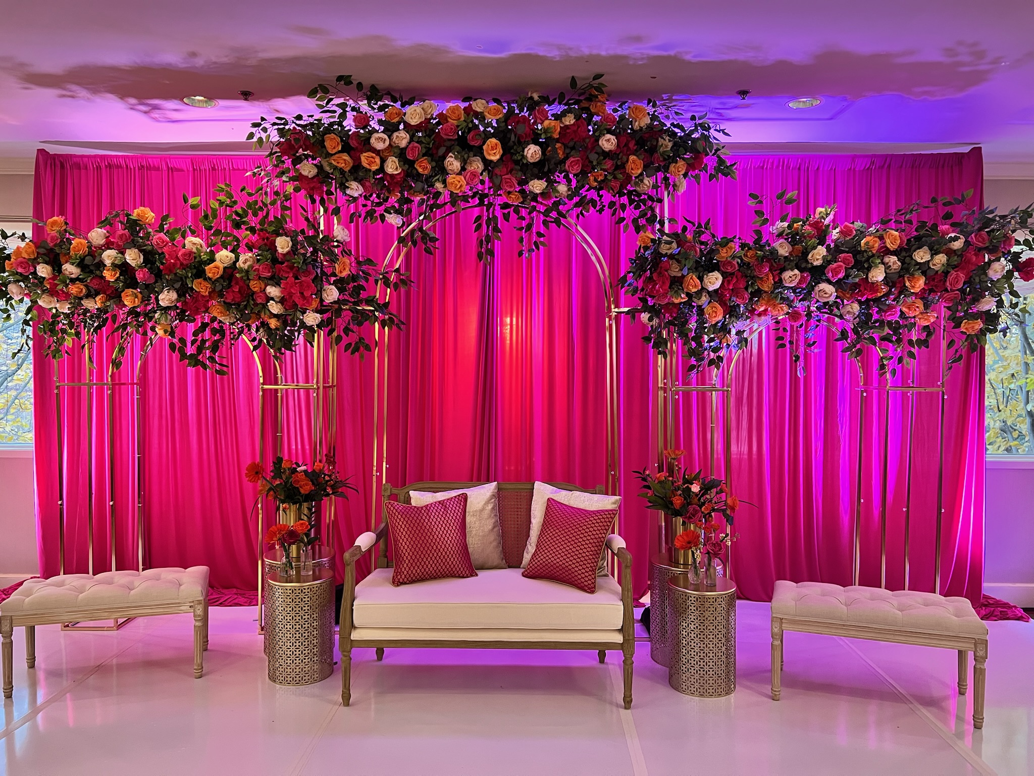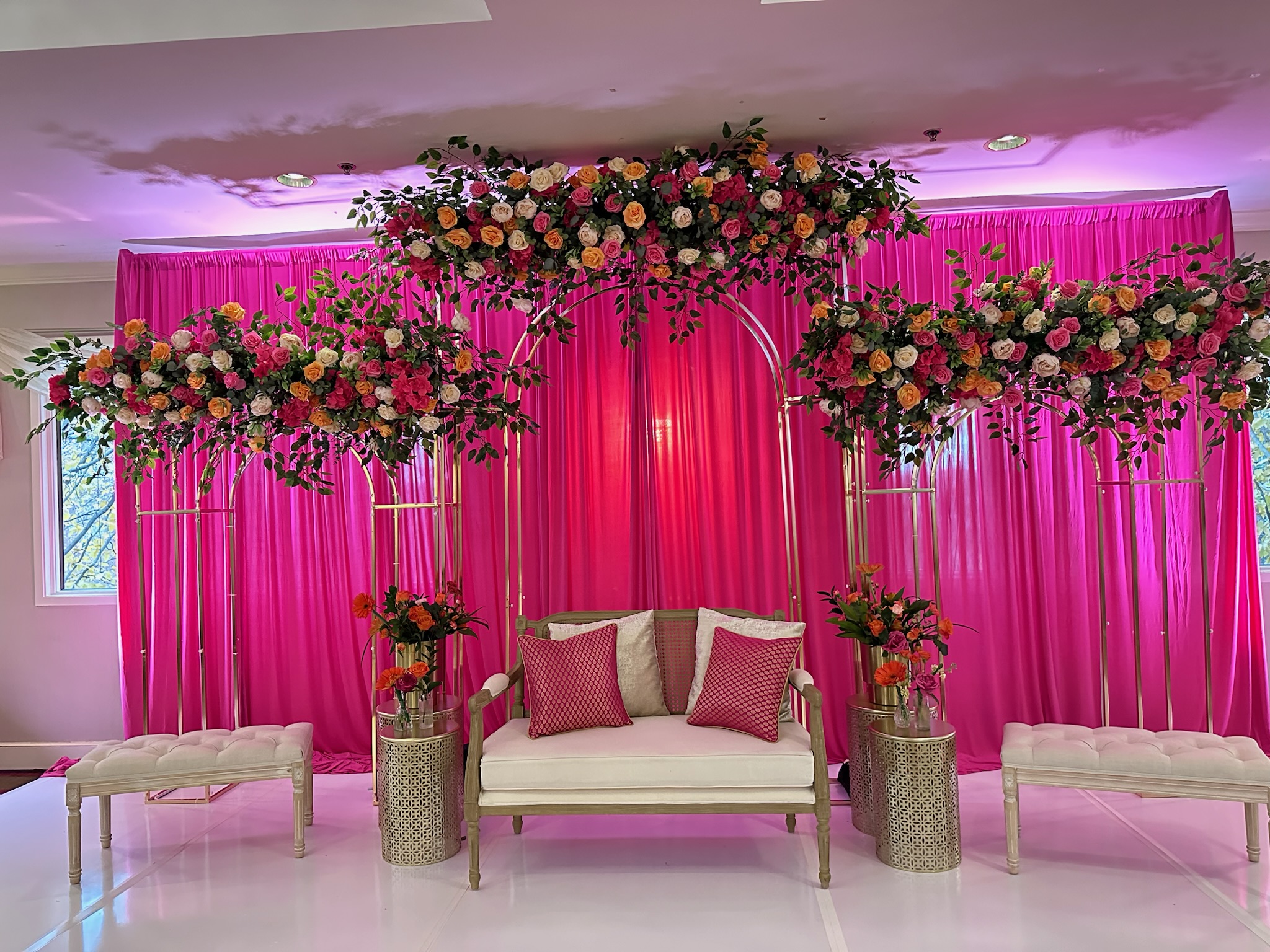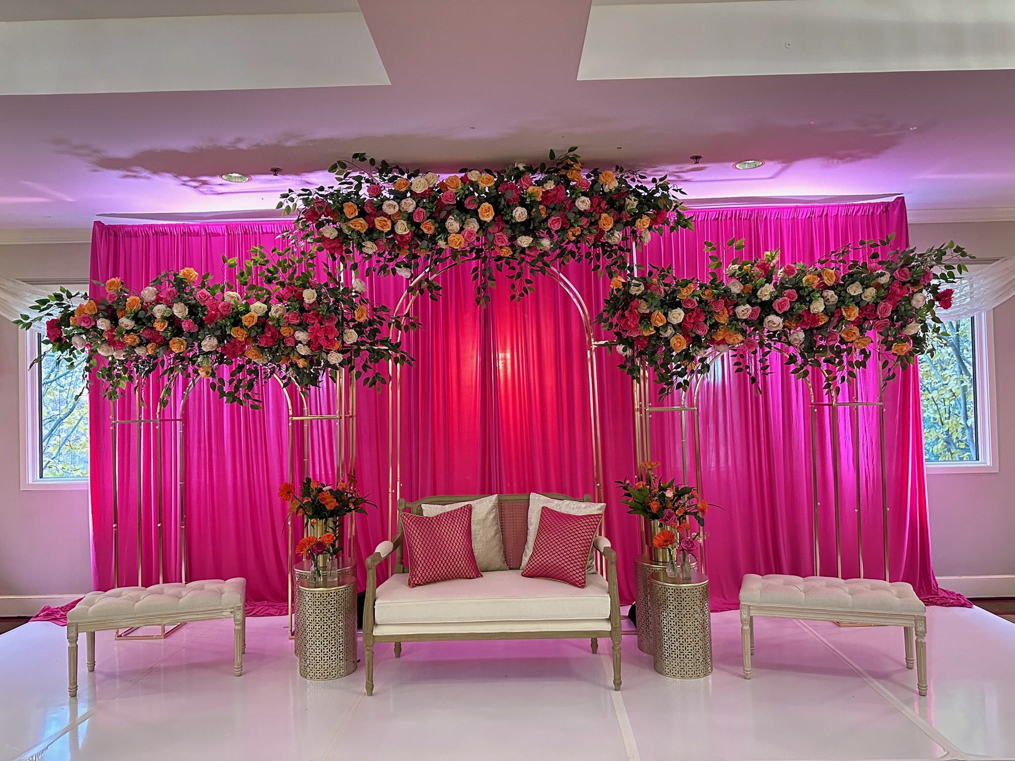 Color Castle is designed for a grand mehndi or sangeet: three golden arches, lush floral bars, and layered draping that frames the couple and reads beautifully in photos and video. We tune the palette to your outfits and venue lighting for the most flattering result.