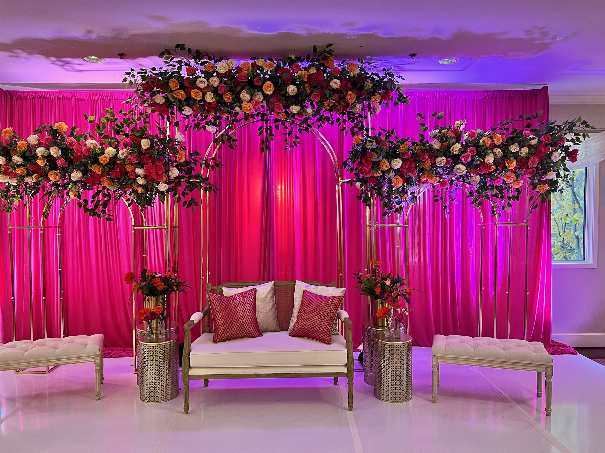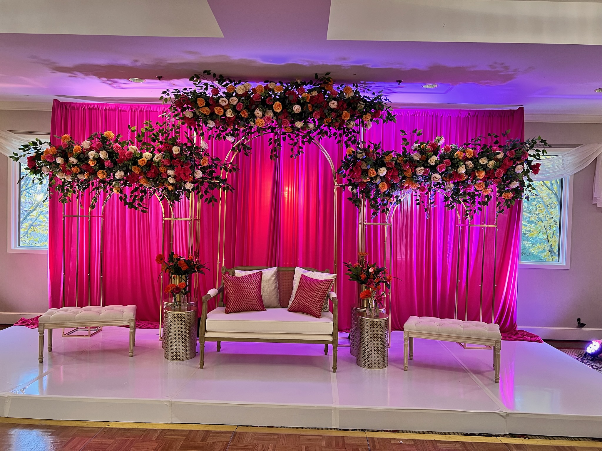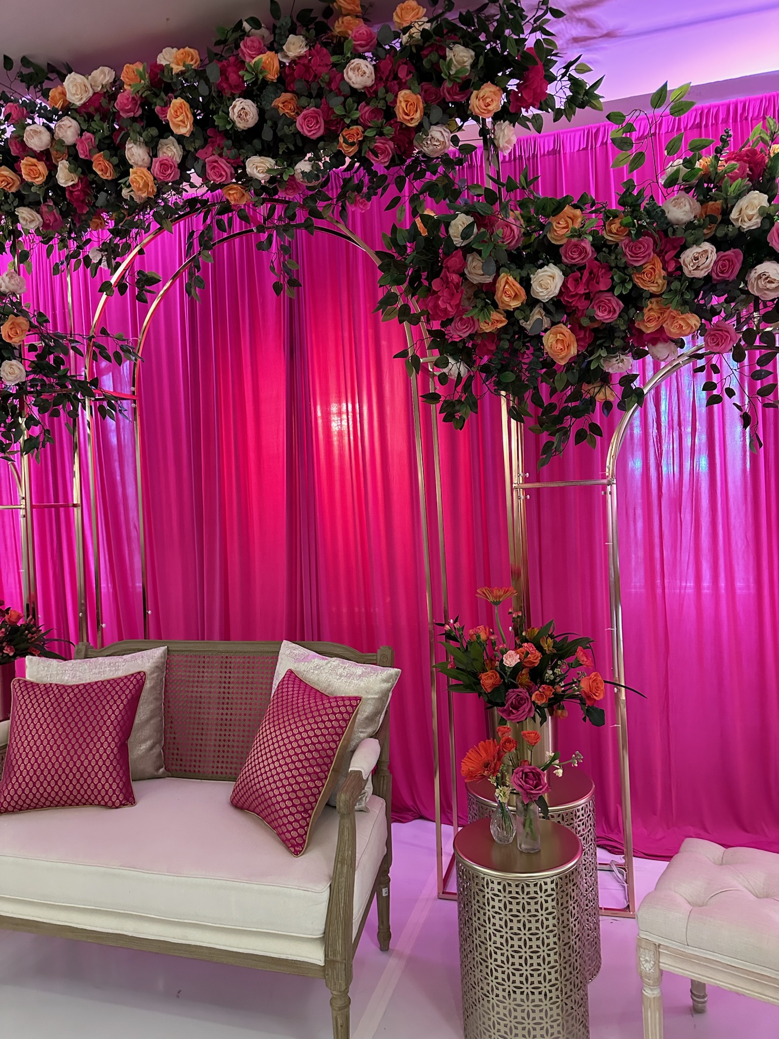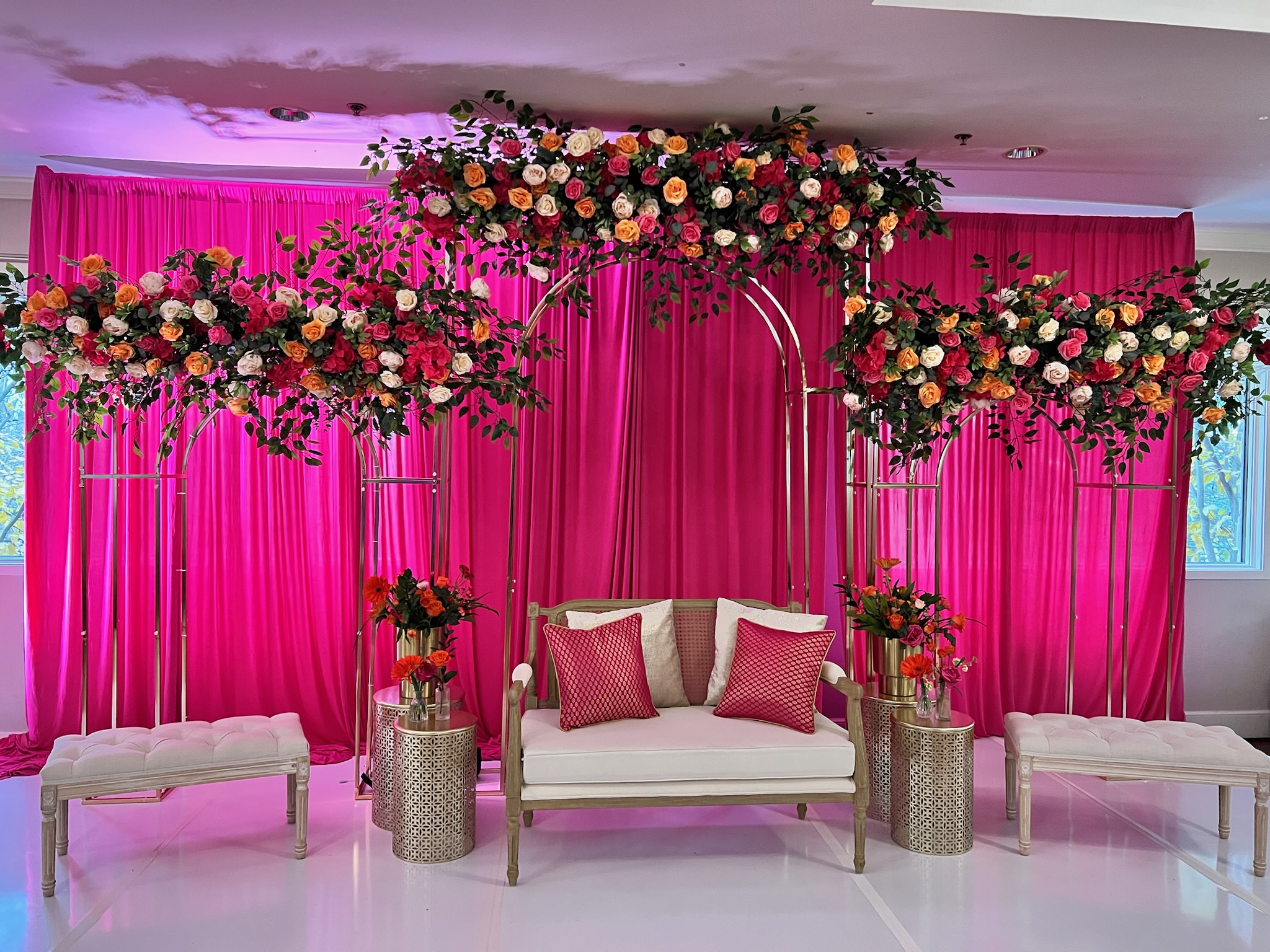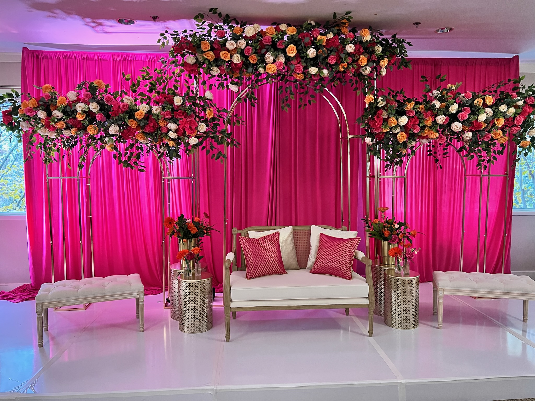 Color Castle is designed for a grand mehndi or sangeet: three golden arches, lush floral bars, and layered draping that frames the couple and reads beautifully in photos and video. We tune the palette to your outfits and venue lighting for the most flattering result.