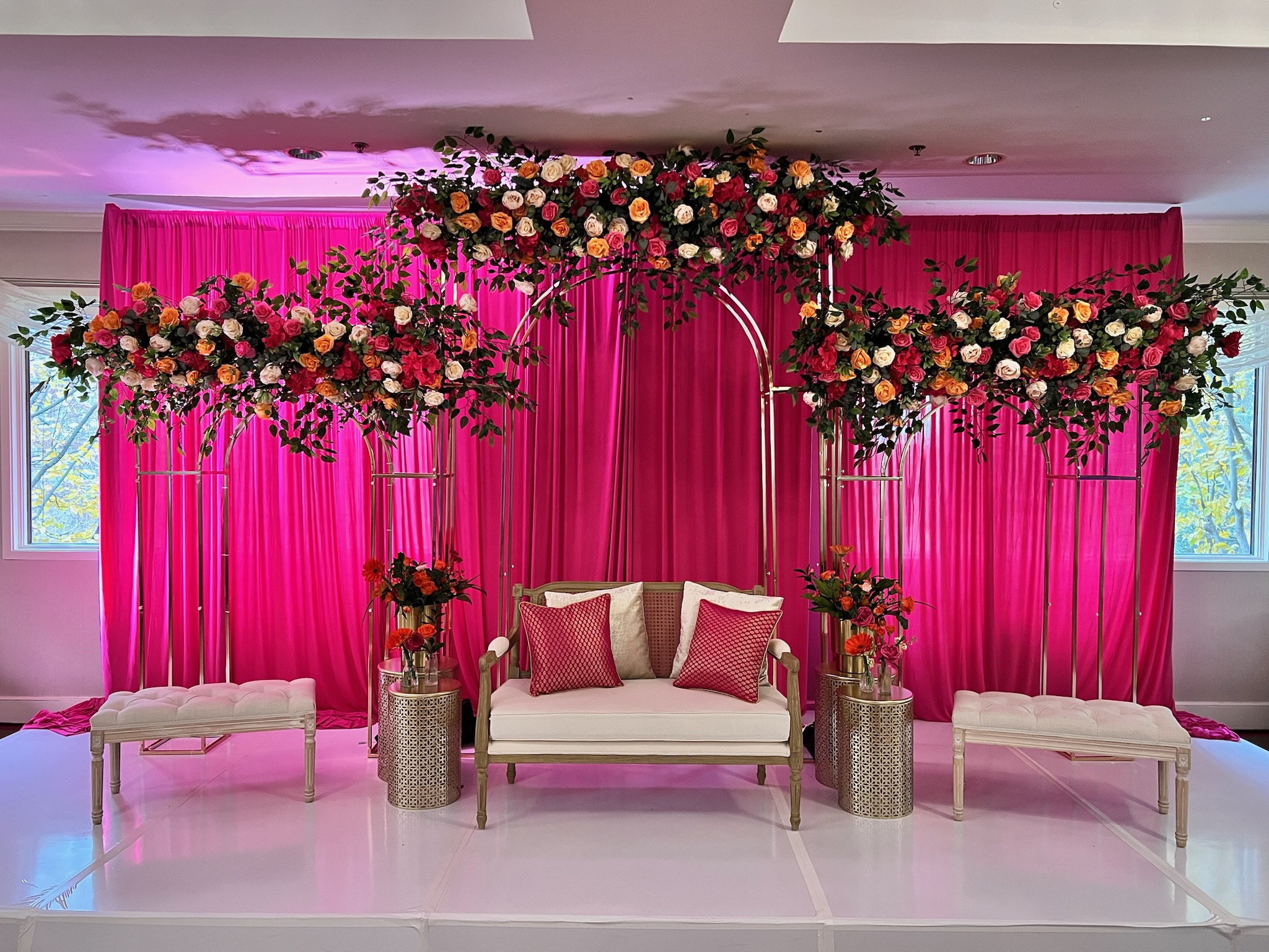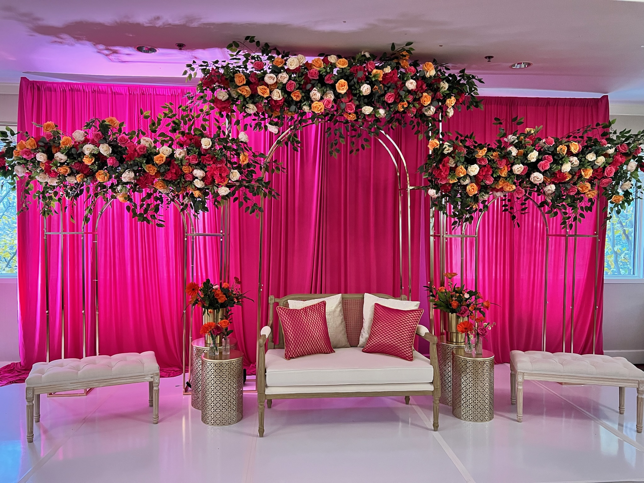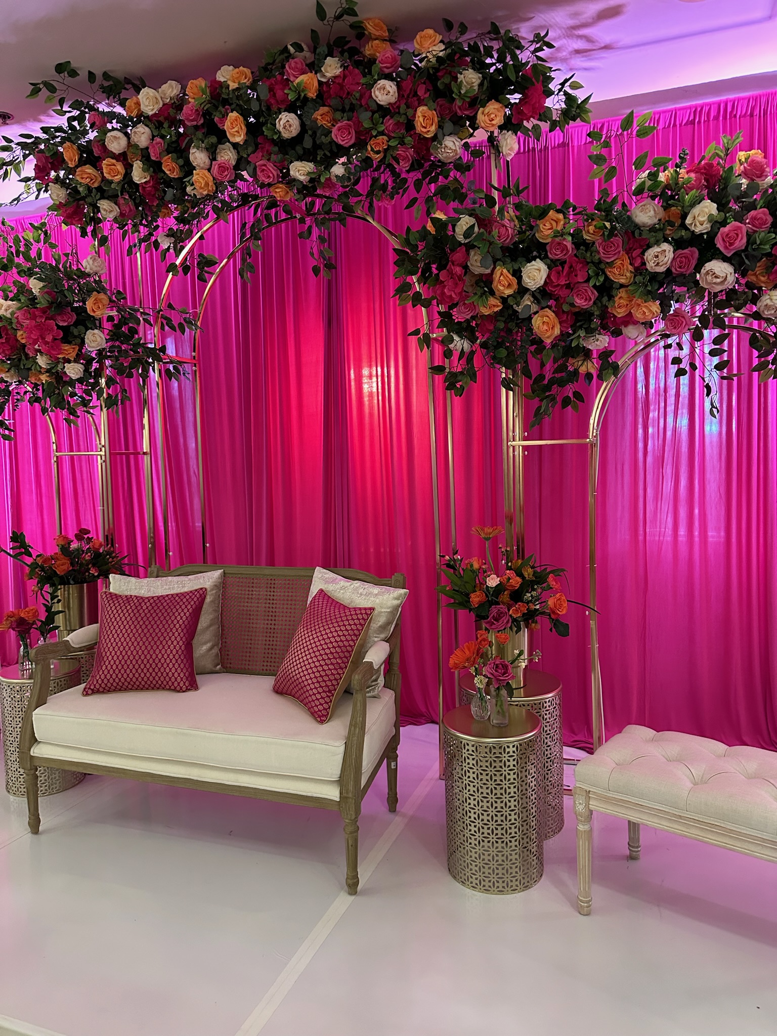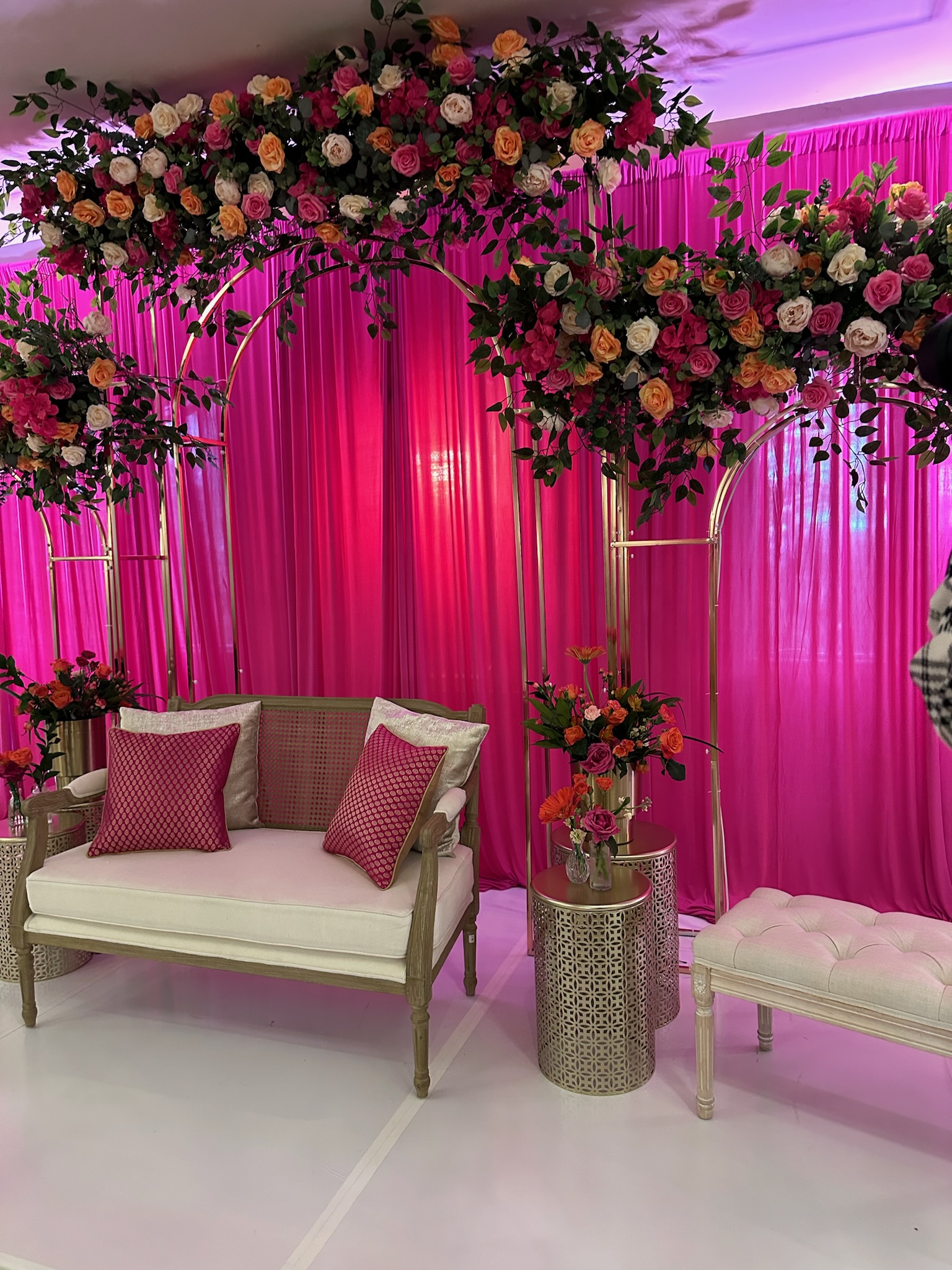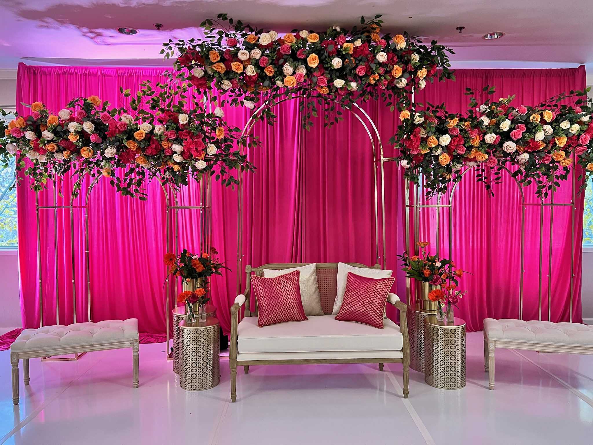 Color Castle is designed for a grand mehndi or sangeet: three golden arches, lush floral bars, and layered draping that frames the couple and reads beautifully in photos and video. We tune the palette to your outfits and venue lighting for the most flattering result.
