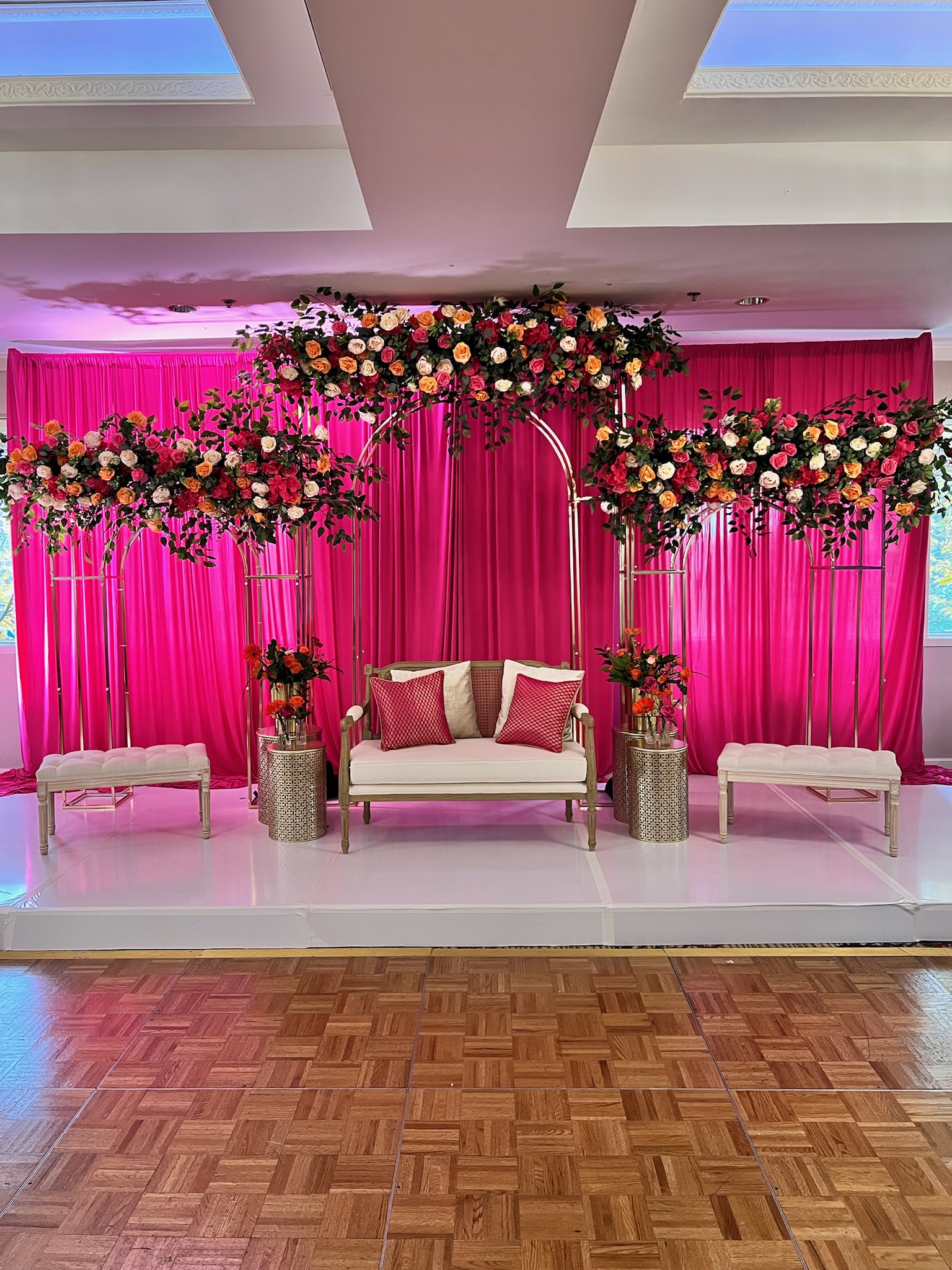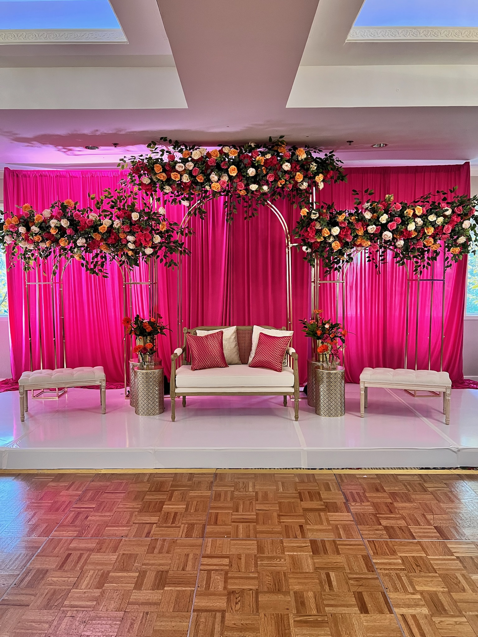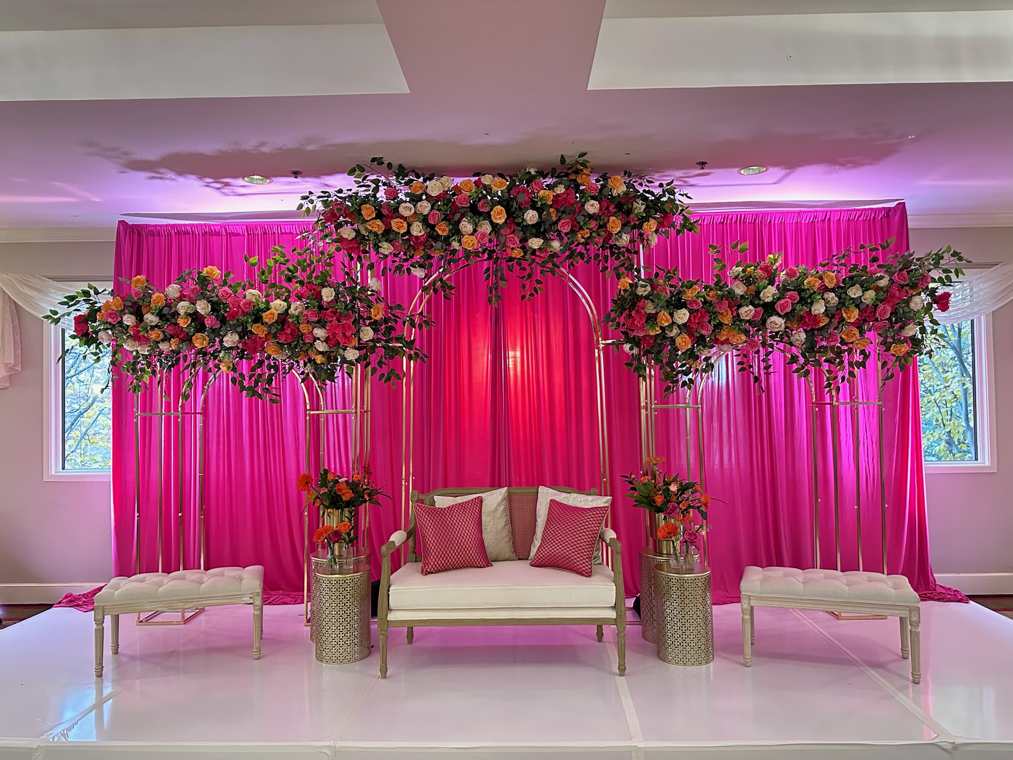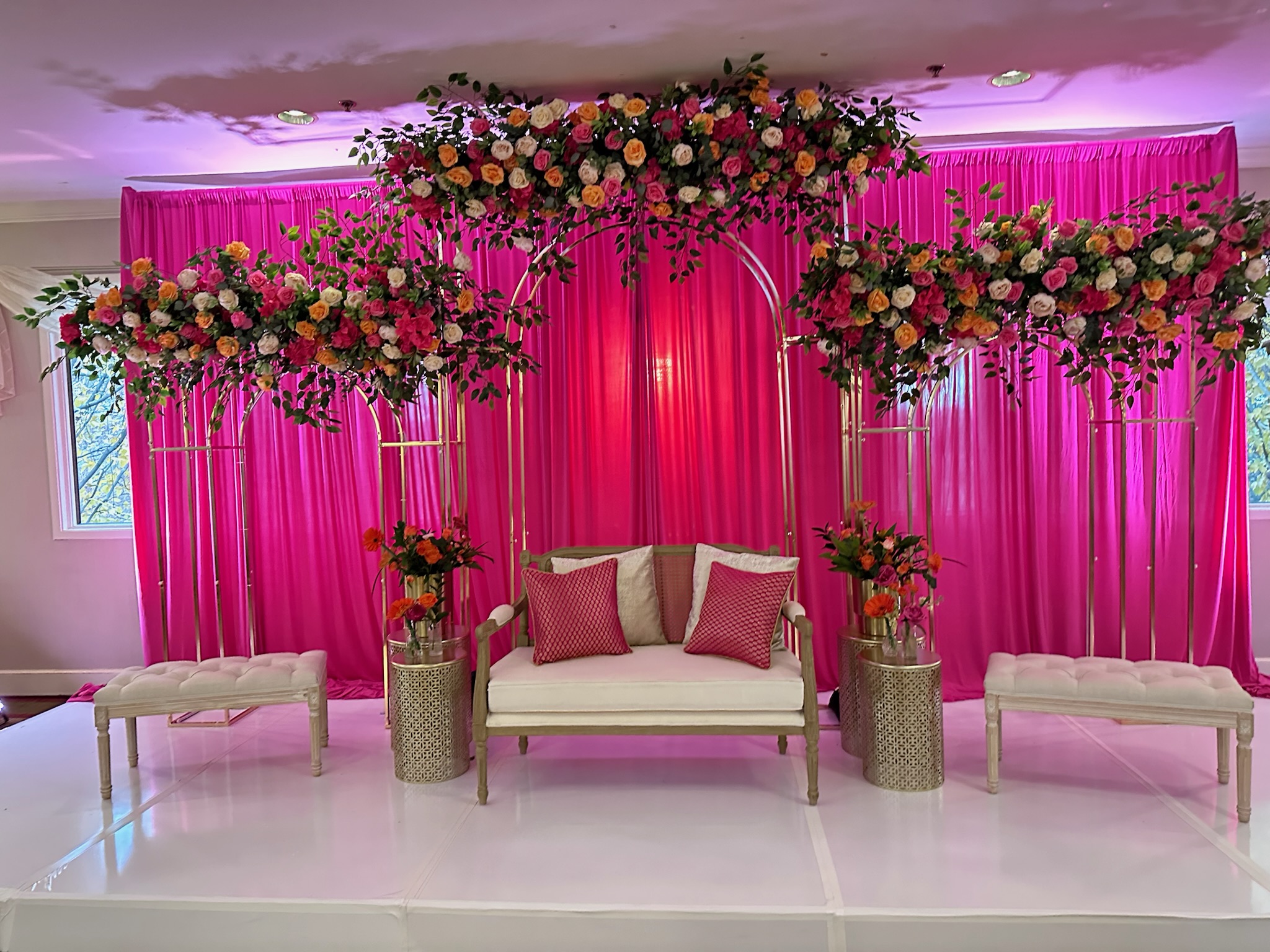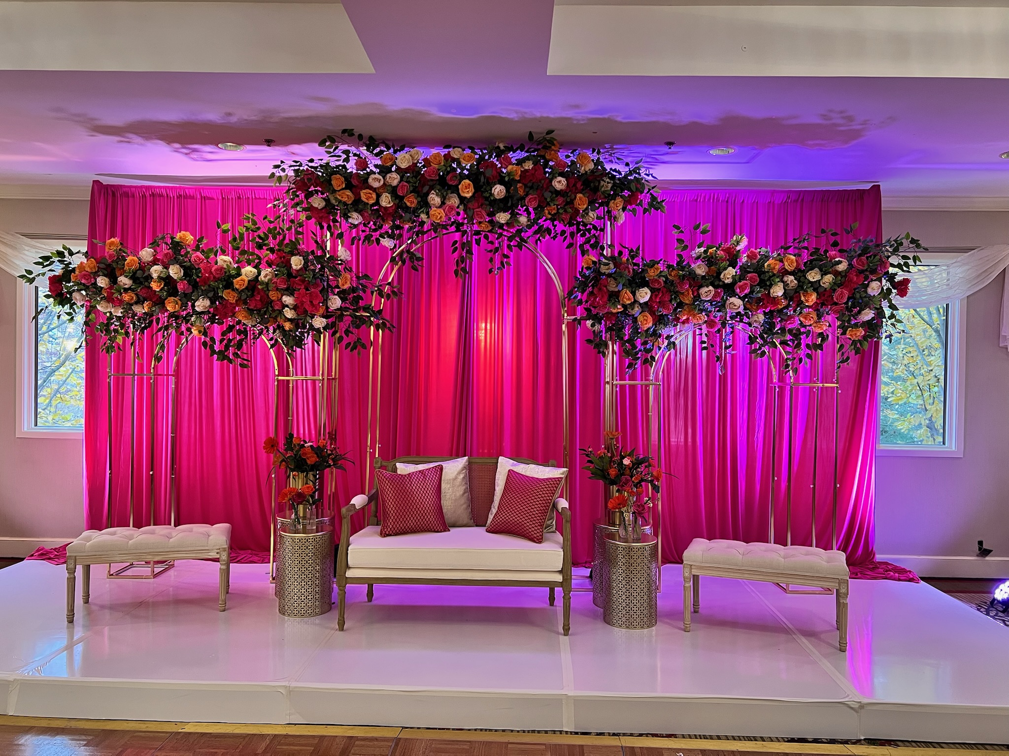 Color Castle is designed for a grand mehndi or sangeet: three golden arches, lush floral bars, and layered draping that frames the couple and reads beautifully in photos and video. We tune the palette to your outfits and venue lighting for the most flattering result.