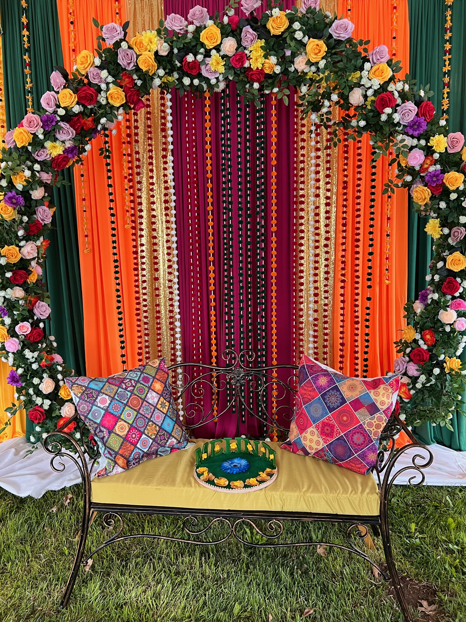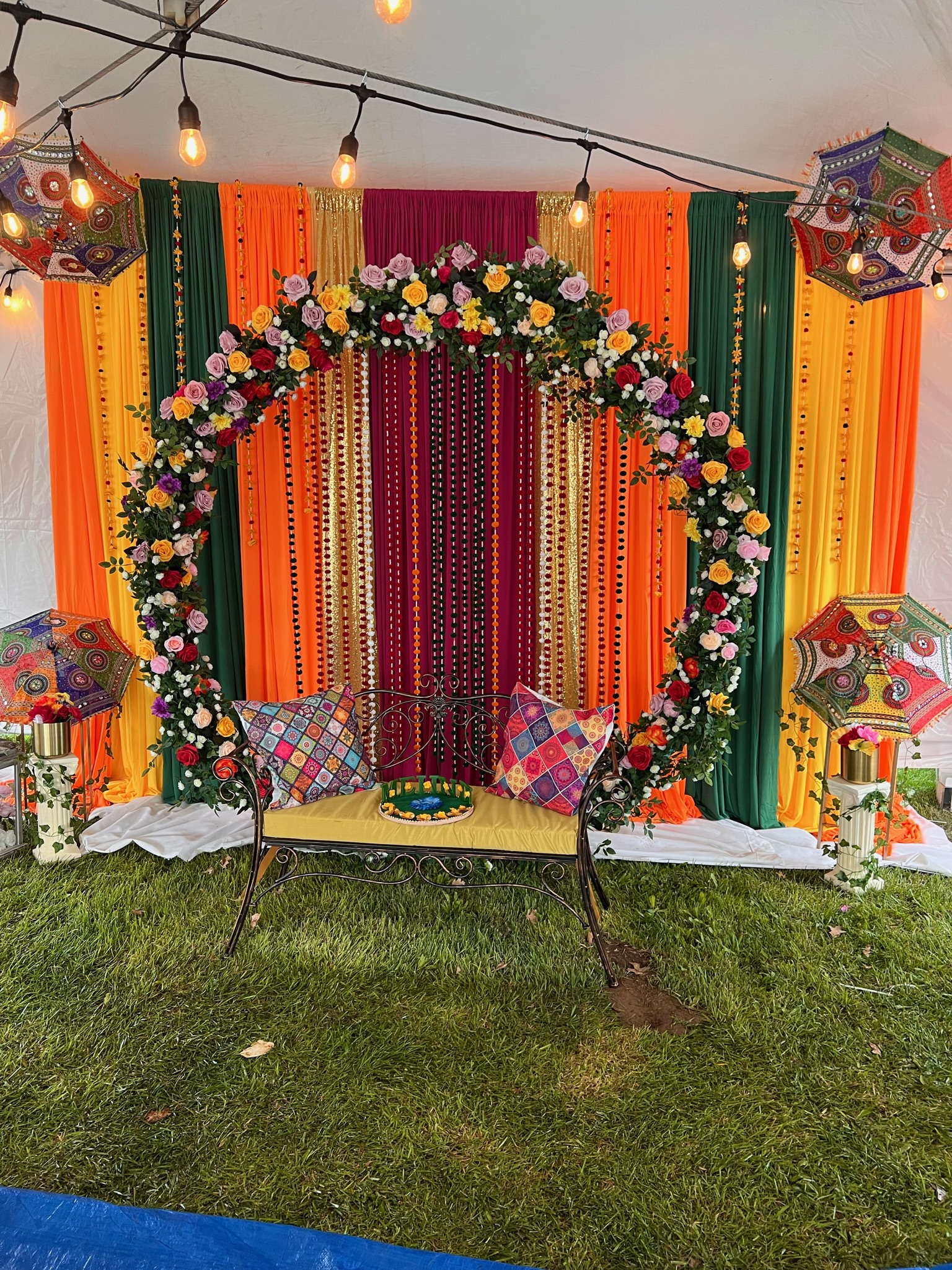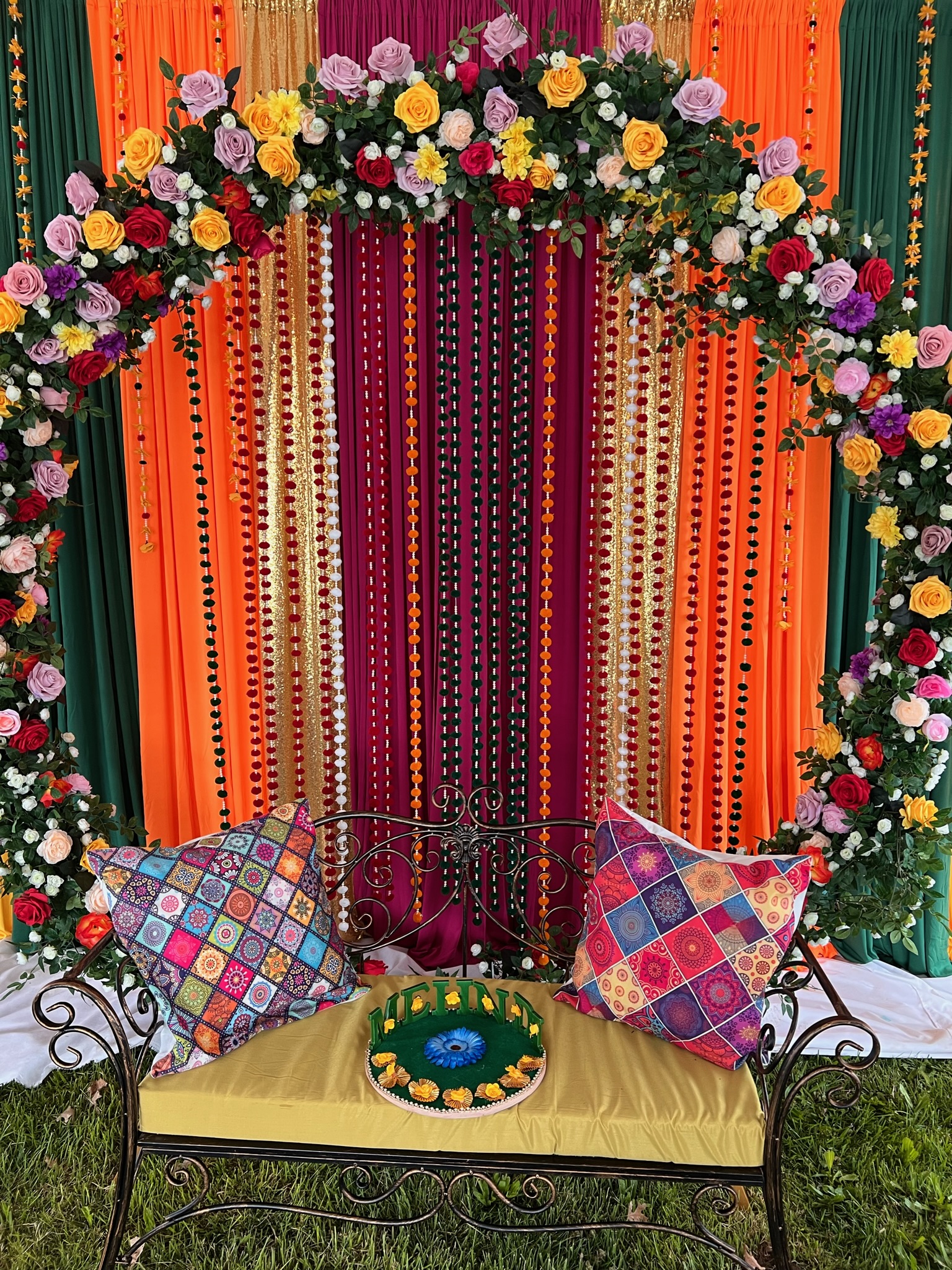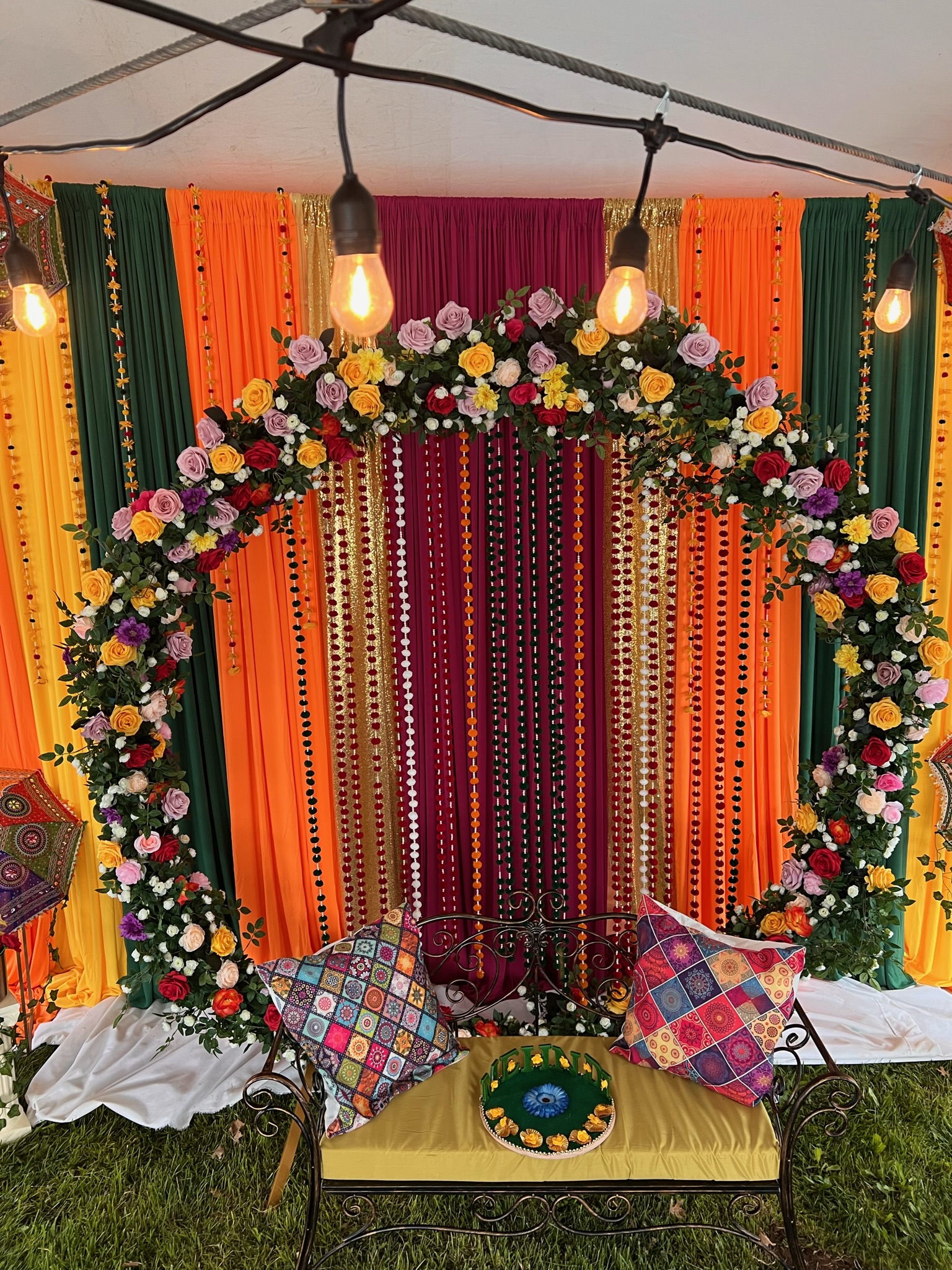 Color Loop is designed for joyful Mehndi energy—a circular frame that creates depth and movement, set in front of vibrant backdrop drapes. Florals and draping can be styled in classic turmeric, fuchsia, emerald, or any custom combination to reflect your family palette.