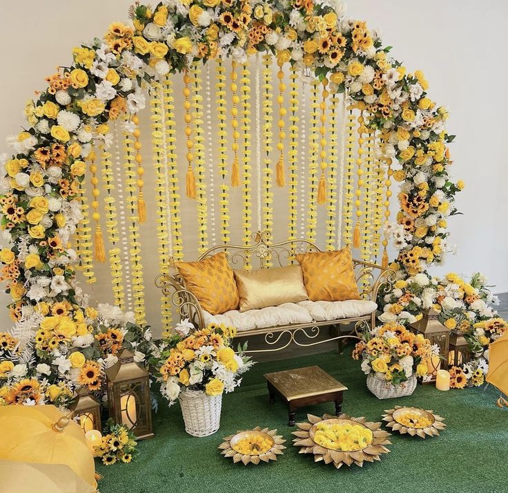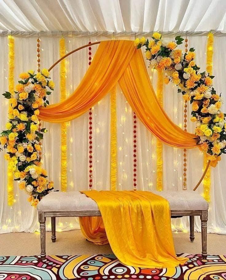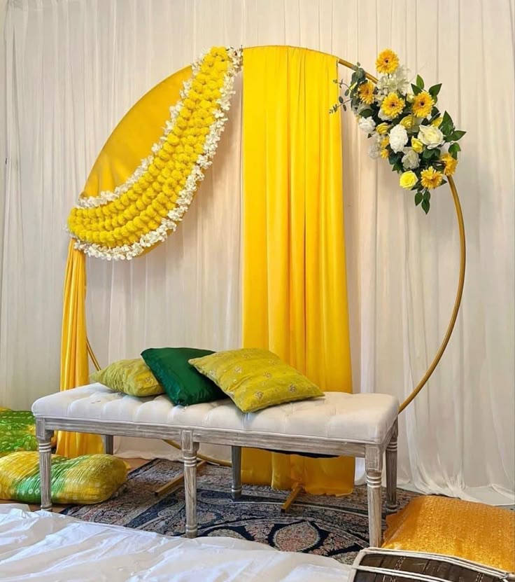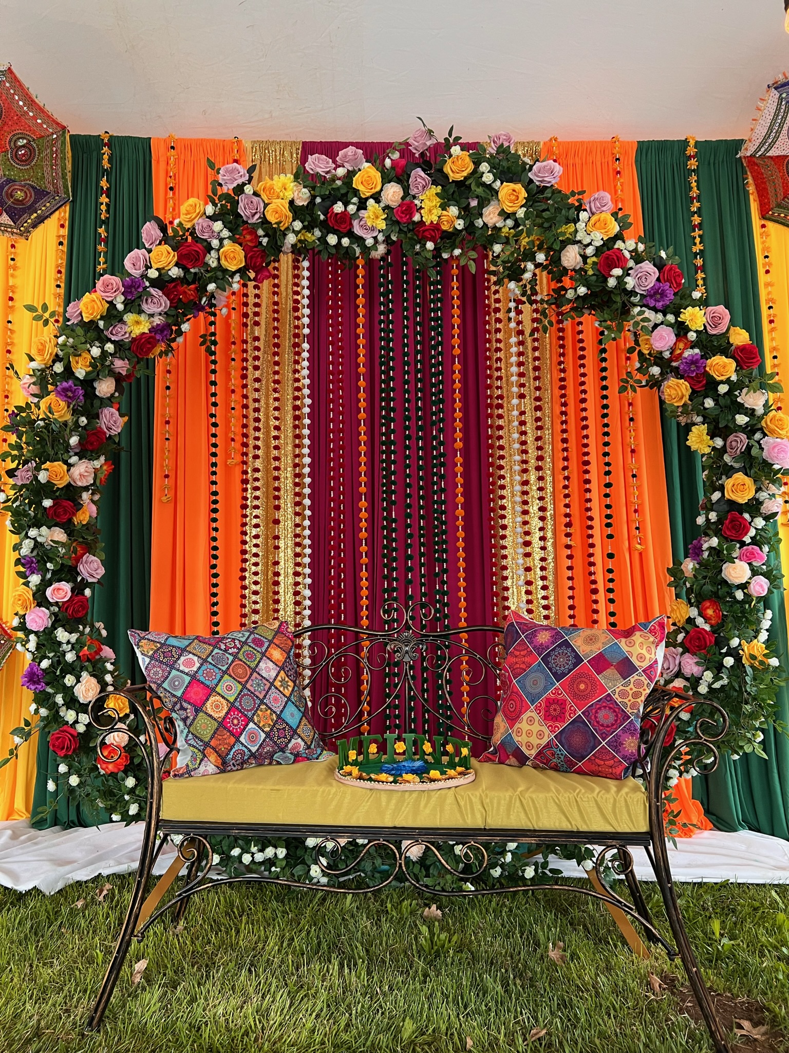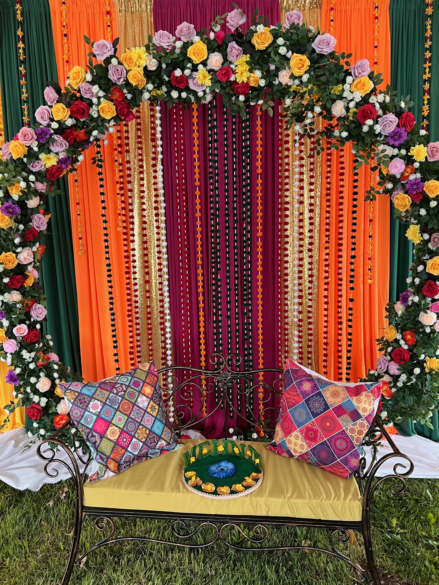 Color Loop is designed for joyful Mehndi energy—a circular frame that creates depth and movement, set in front of vibrant backdrop drapes. Florals and draping can be styled in classic turmeric, fuchsia, emerald, or any custom combination to reflect your family palette.
