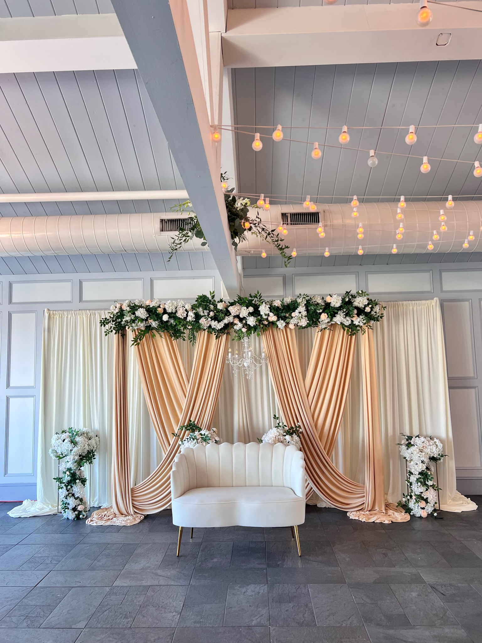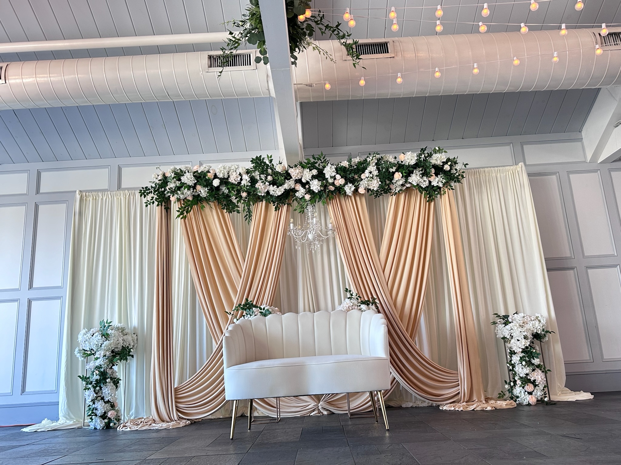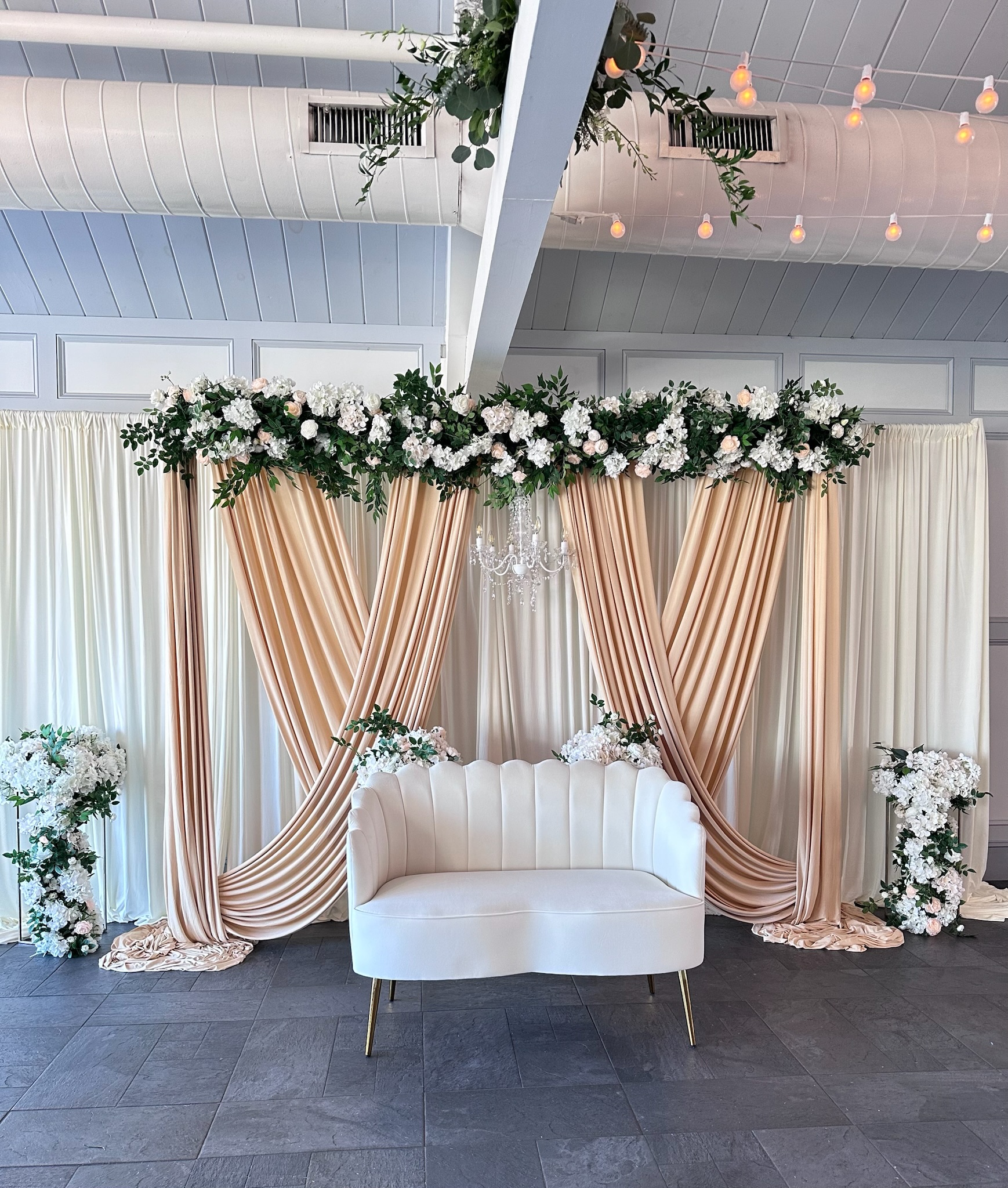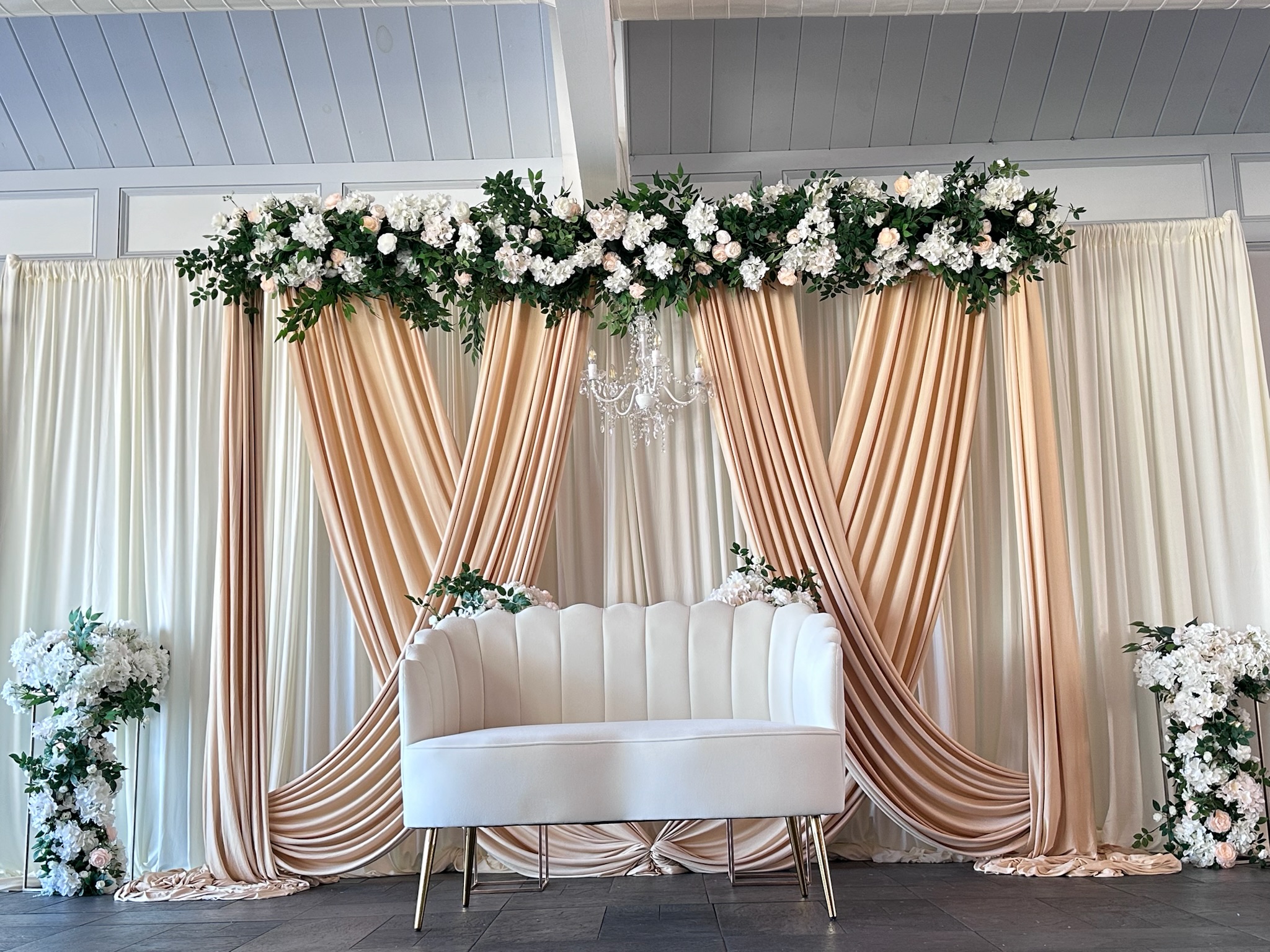 Floral Drapes brings editorial polish to smaller rooms. The square floral frame anchors the scene while layered draping softens the background and draws the eye to the couple. Palette, florals, and fabric treatments are tailored to your venue and vision—elegant, modern, and beautifully finished.