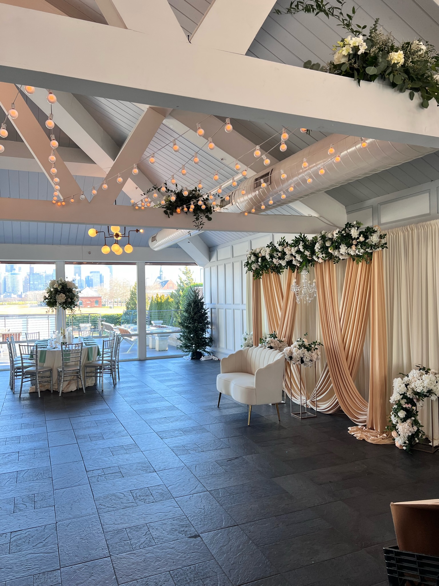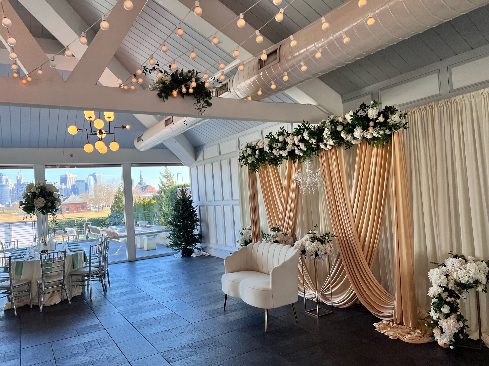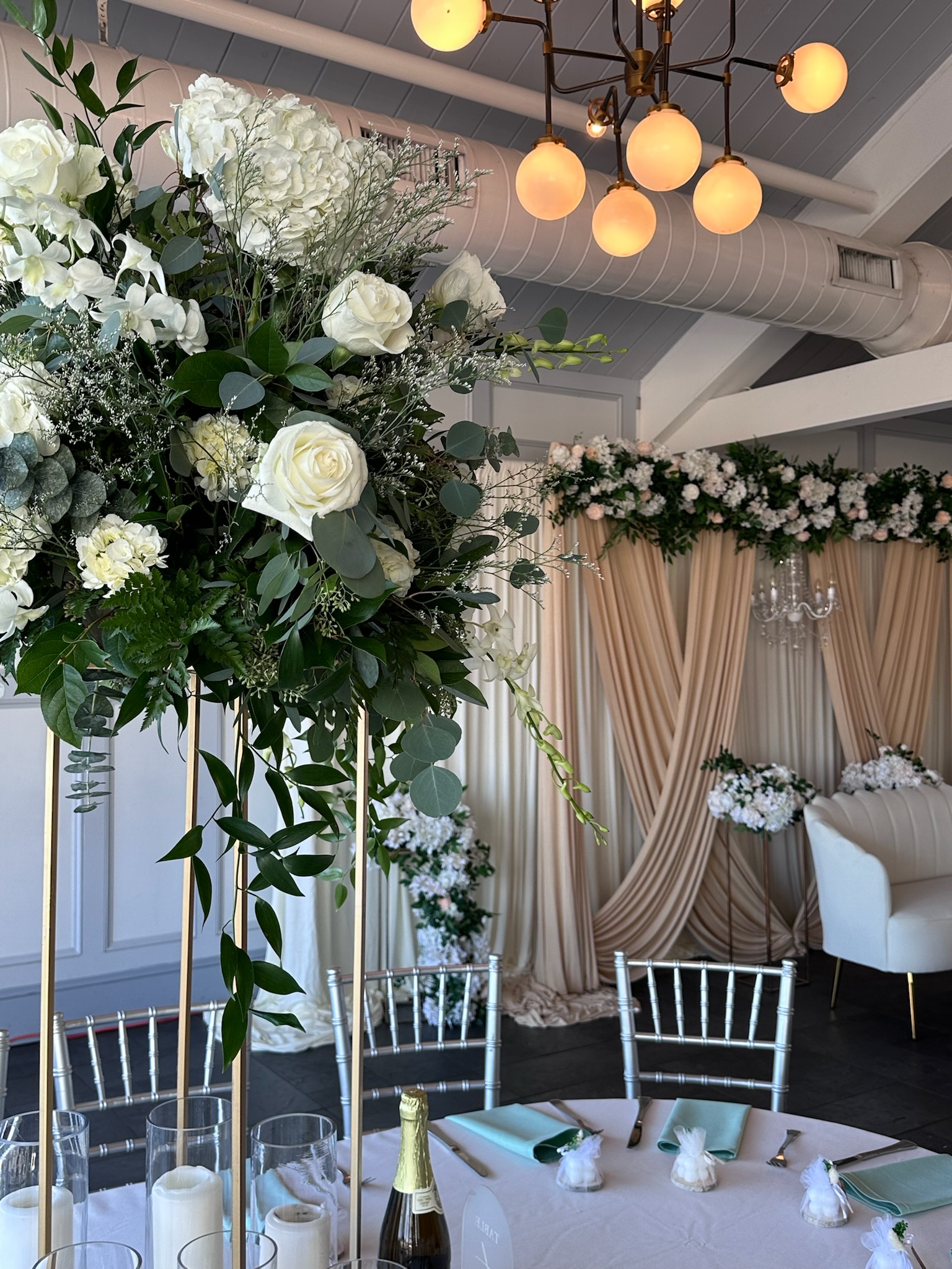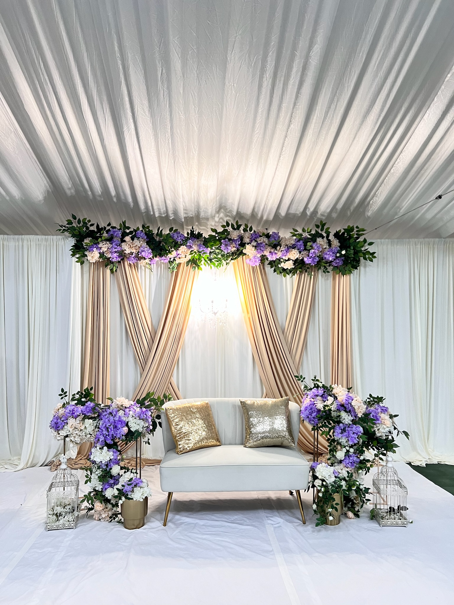 Floral Drapes brings editorial polish to smaller rooms. The square floral frame anchors the scene while layered draping softens the background and draws the eye to the couple. Palette, florals, and fabric treatments are tailored to your venue and vision—elegant, modern, and beautifully finished.