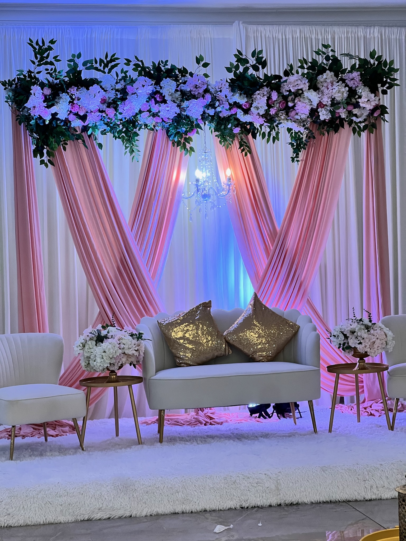 We layer the drapes in soft folds to create a flowing, graceful backdrop. The floral bar on top adds fullness and structure, keeping the frame light yet luxurious. Gentle lighting or a chandelier complements the warm tones, giving the setup a calm, romantic glow ideal for evening celebrations.
