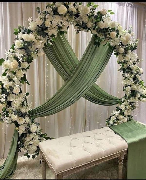 Floral Grace is a polished, romantic composition: a gold circular arch fully dressed in florals, with soft custom draping and clean, coordinated accents. We tune palette, floral density and fabric finish to your venue so the set feels designed for the room—not dropped into it.