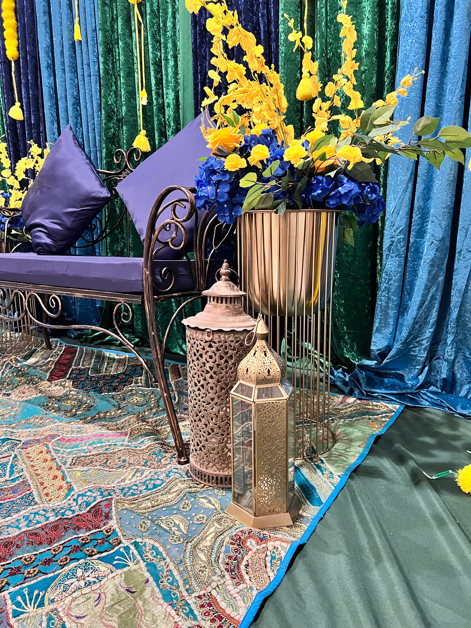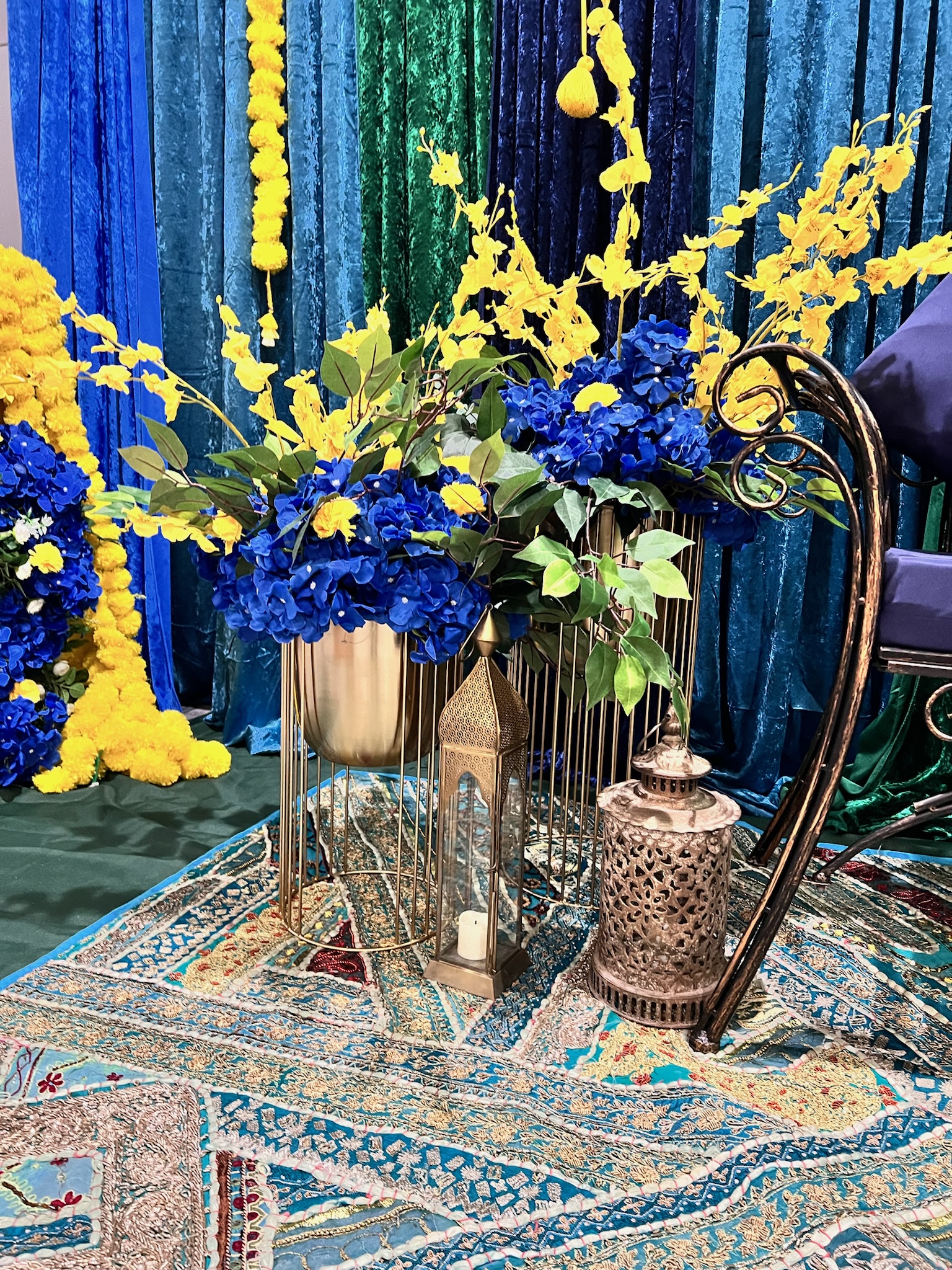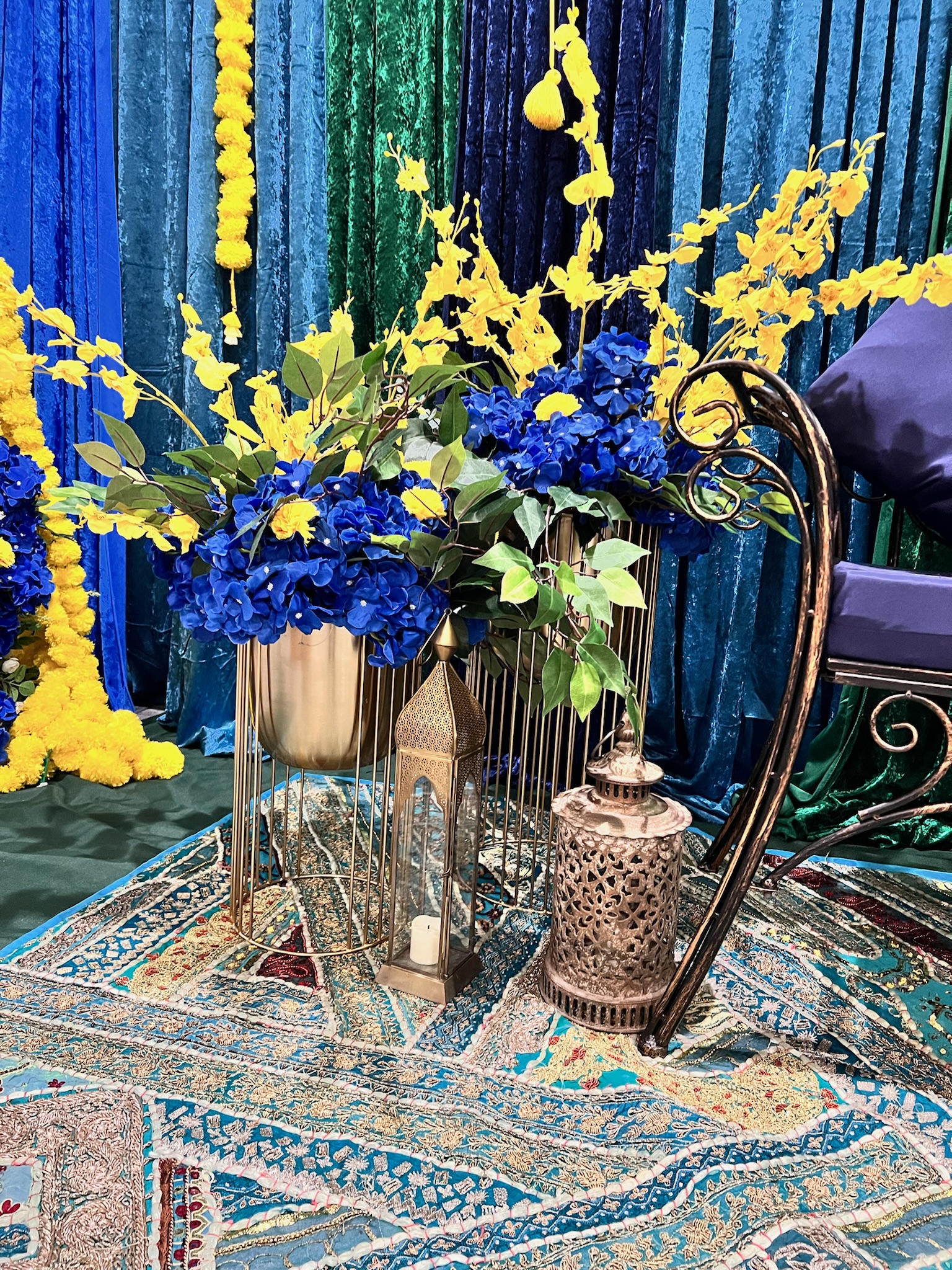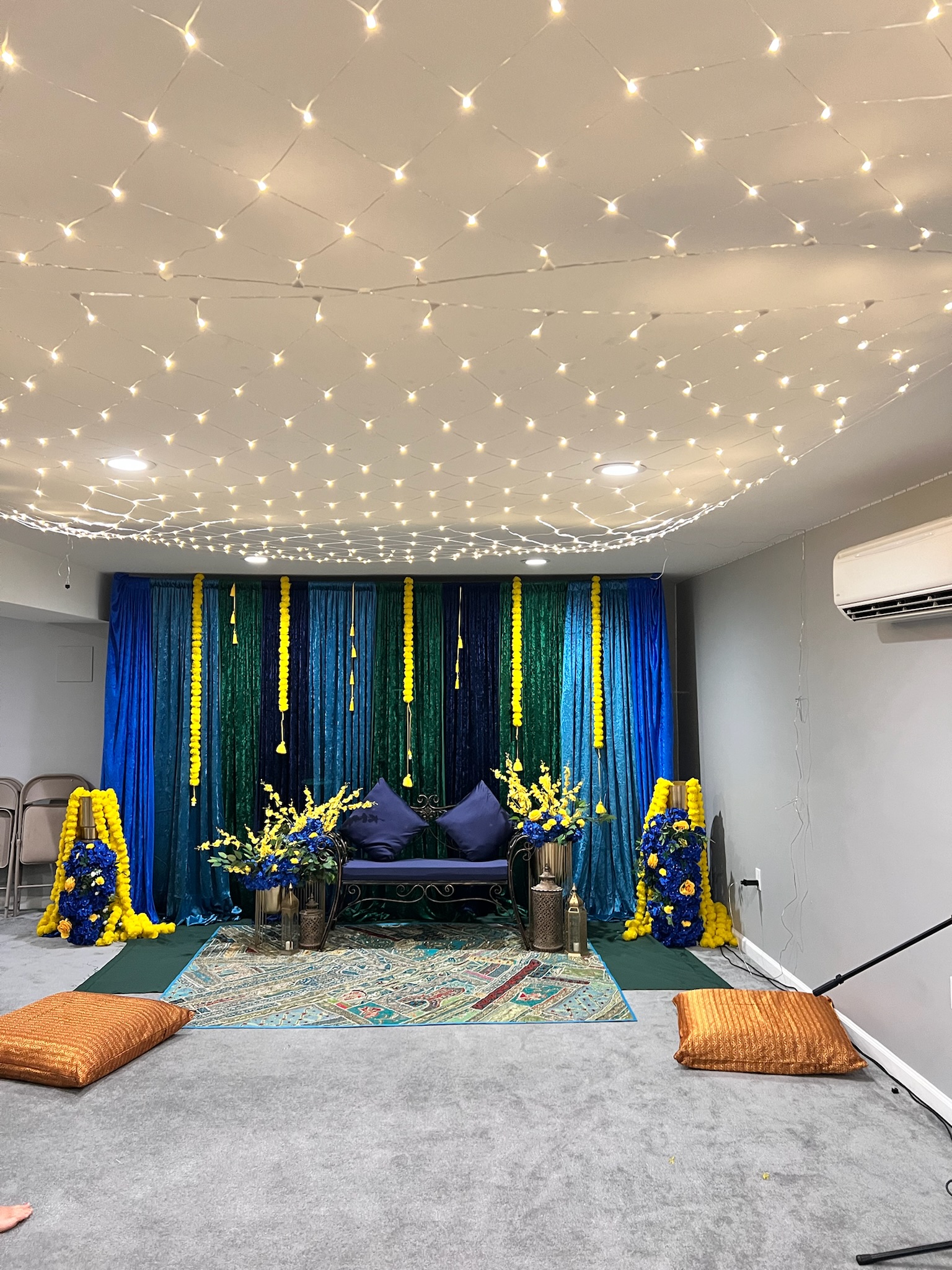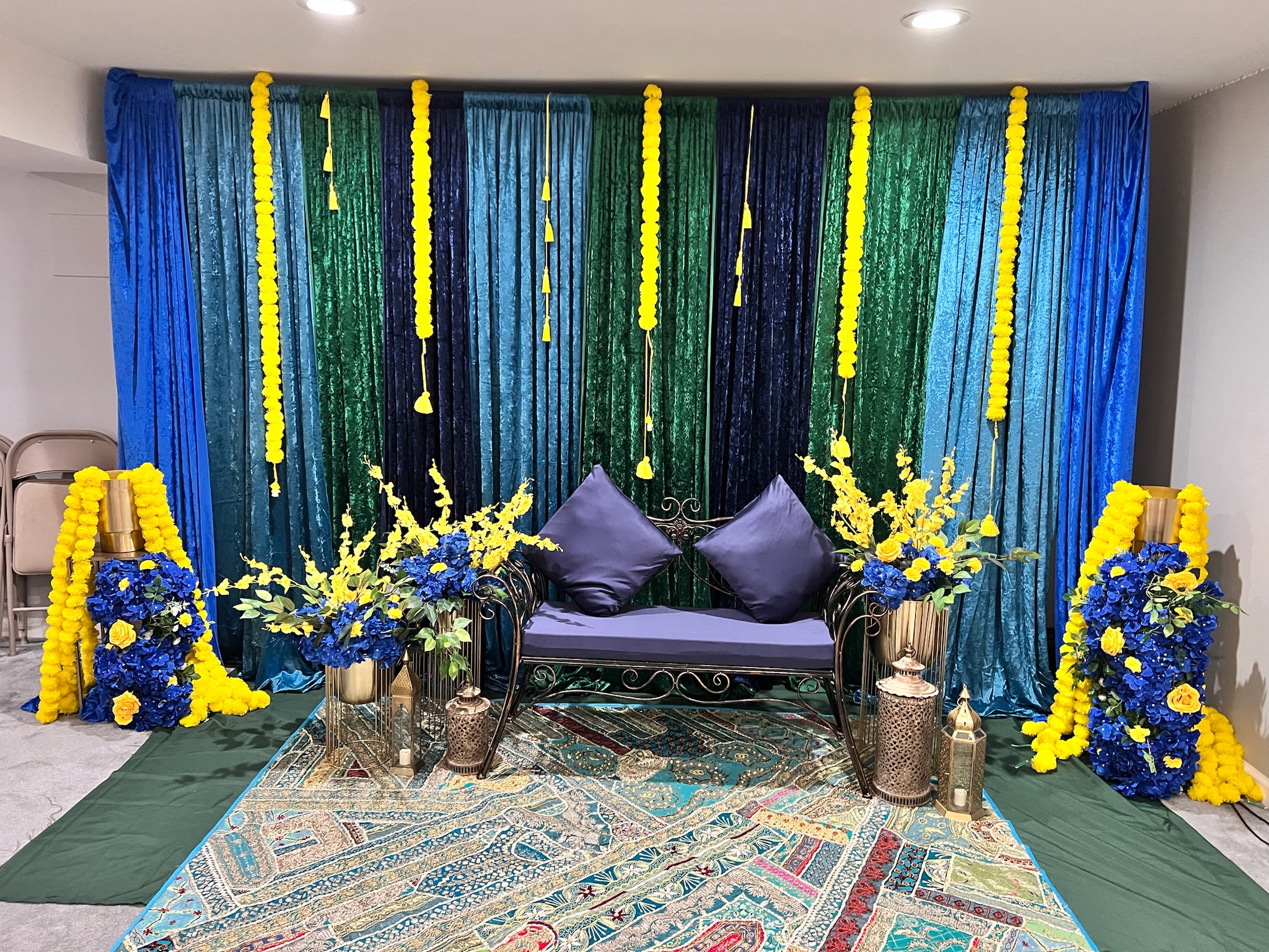 Night Sky is designed for evening Mehndis and indoor halls where color and glow do the storytelling. Layered drapes in sapphire, teal, emerald, and marigold create a rich canvas; garlands and metallic accents bring sparkle while still feeling composed and premium.