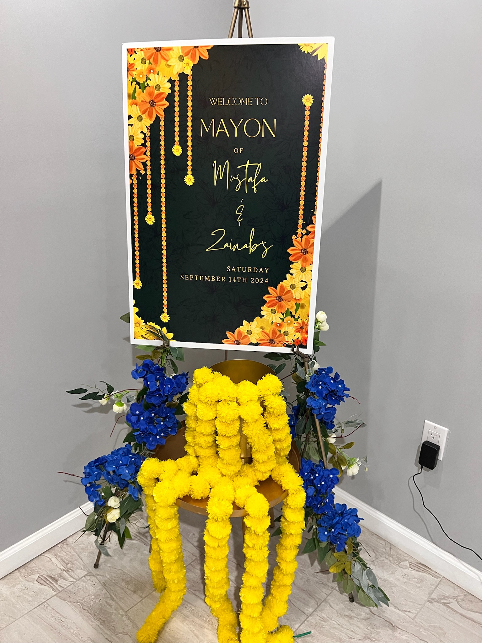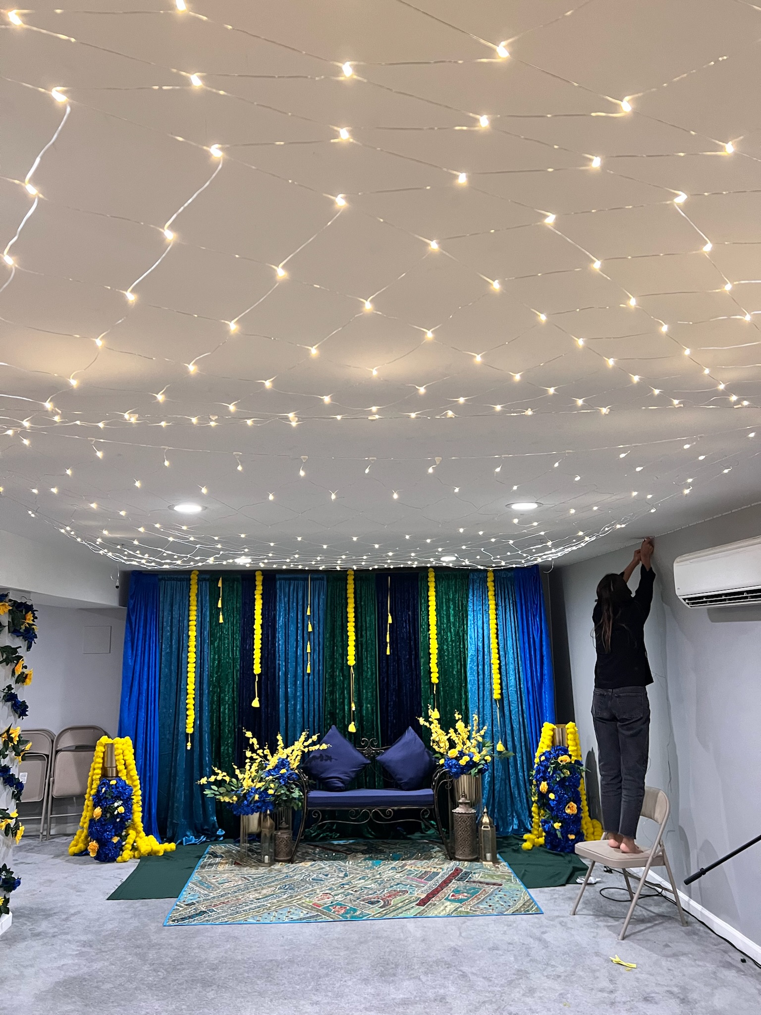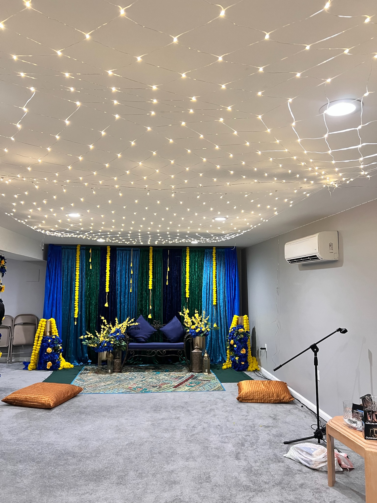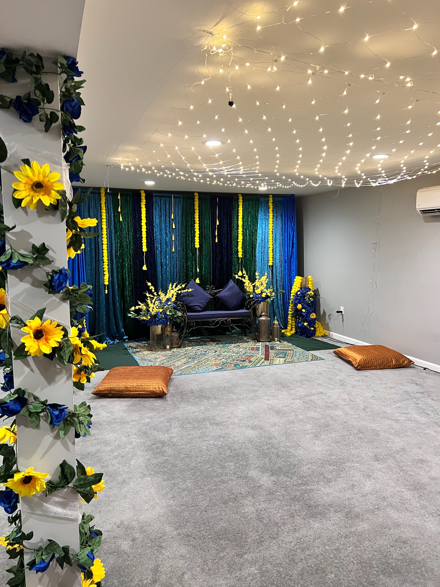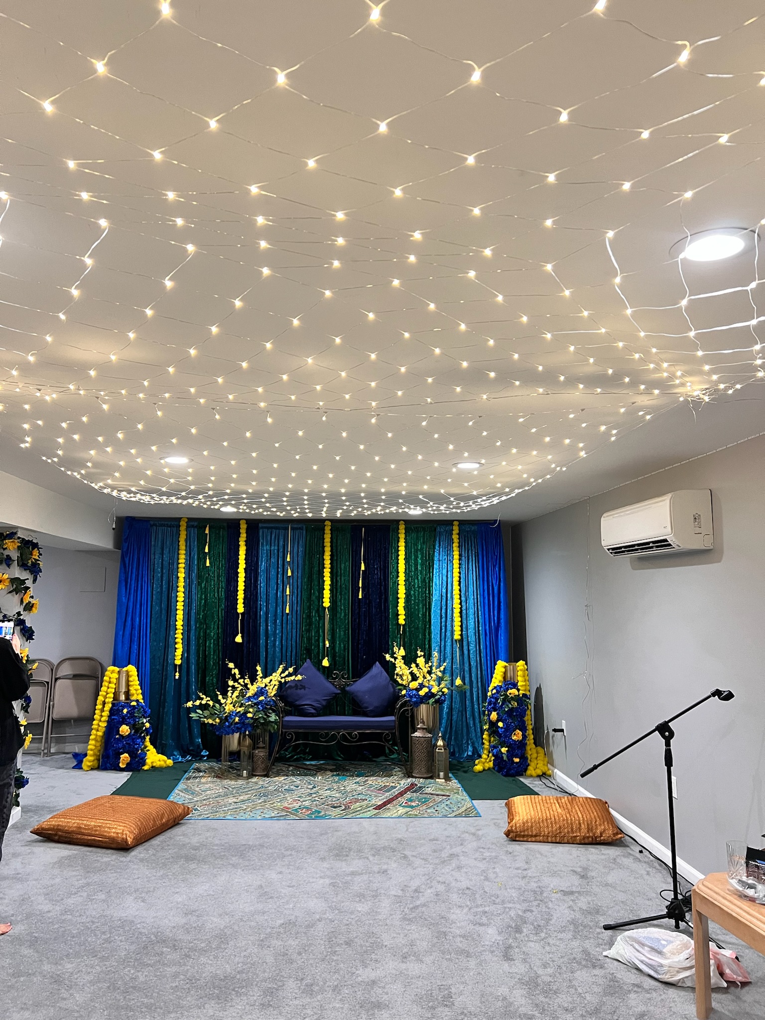 Night Sky is designed for evening Mehndis and indoor halls where color and glow do the storytelling. Layered drapes in sapphire, teal, emerald, and marigold create a rich canvas; garlands and metallic accents bring sparkle while still feeling composed and premium.