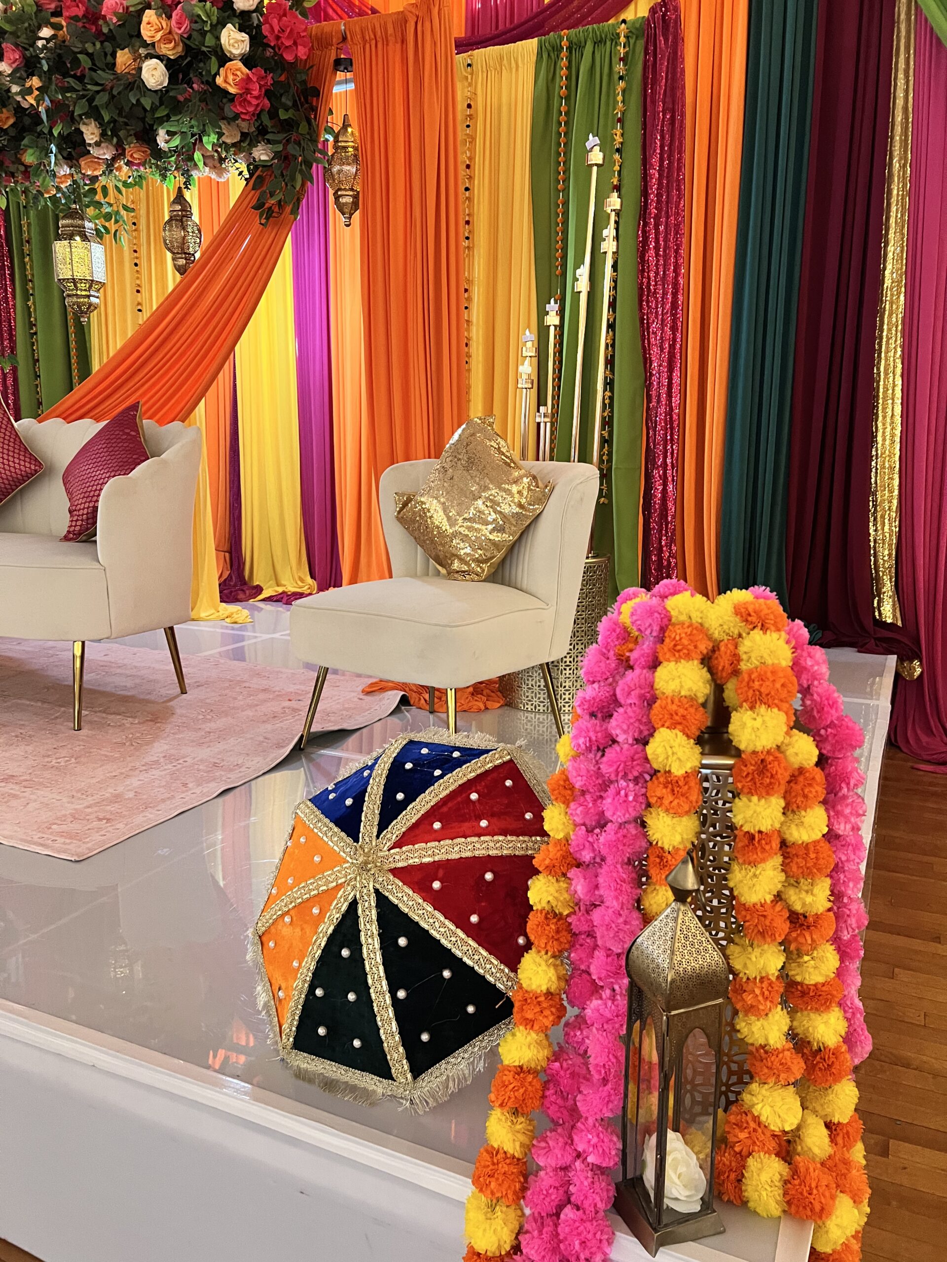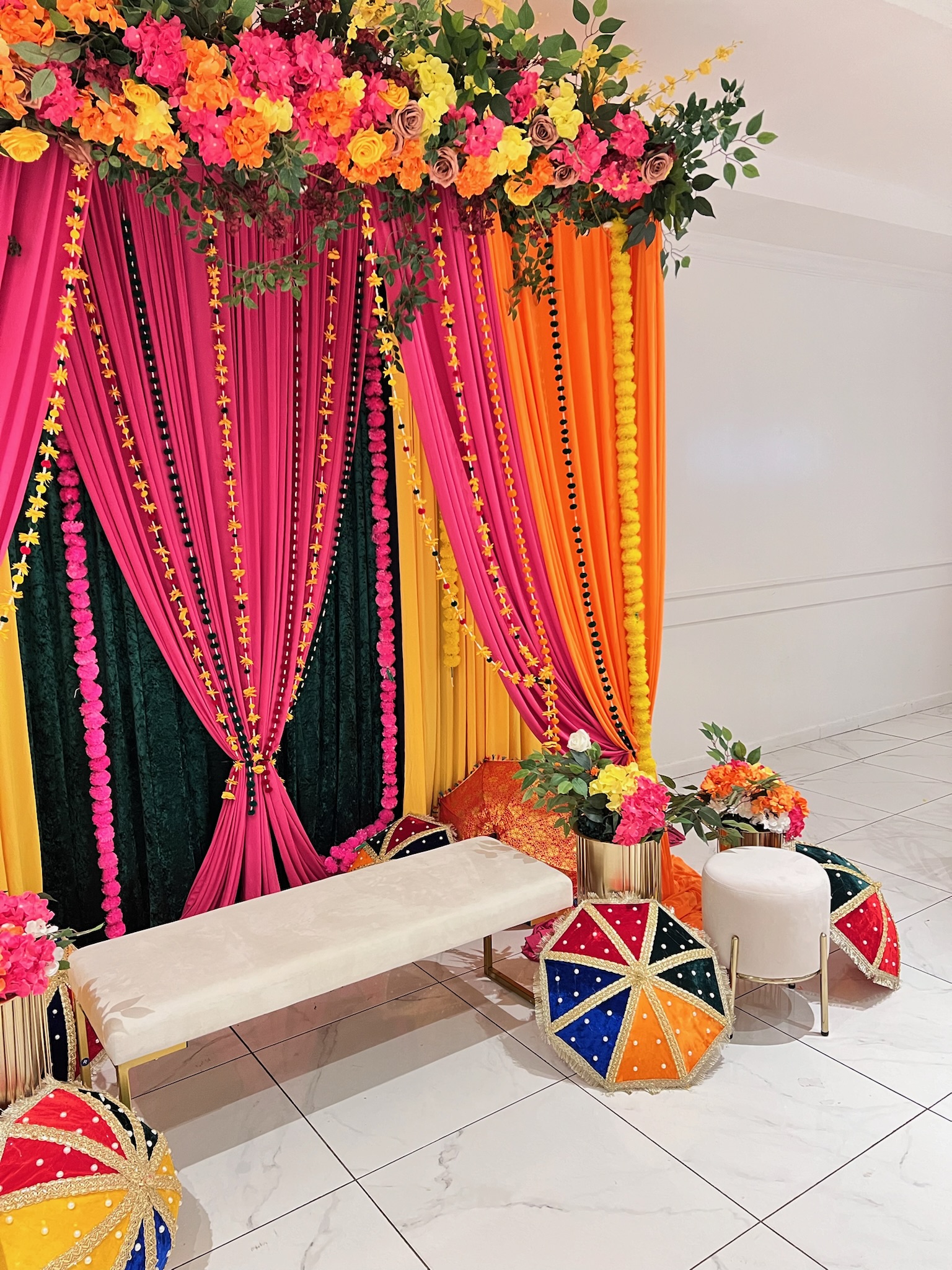 We keep the drapes layered and flowing to let each color shine without feeling crowded. The floral bar adds a soft contrast to the bright backdrop, keeping the look lively yet balanced. Lanterns and warm lights highlight the textures beautifully, while daylight brings out the richness of each tone for vibrant, natural photos.