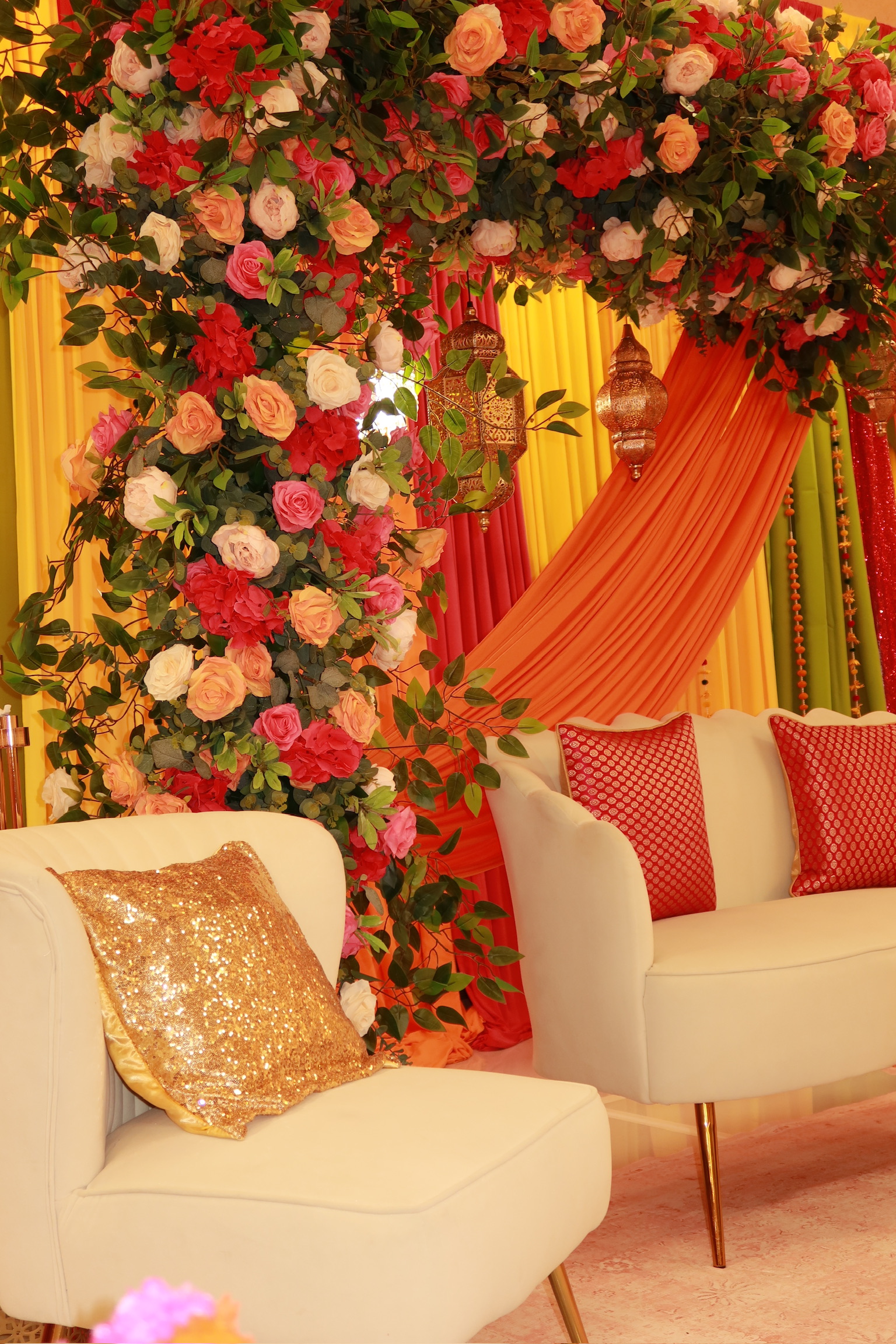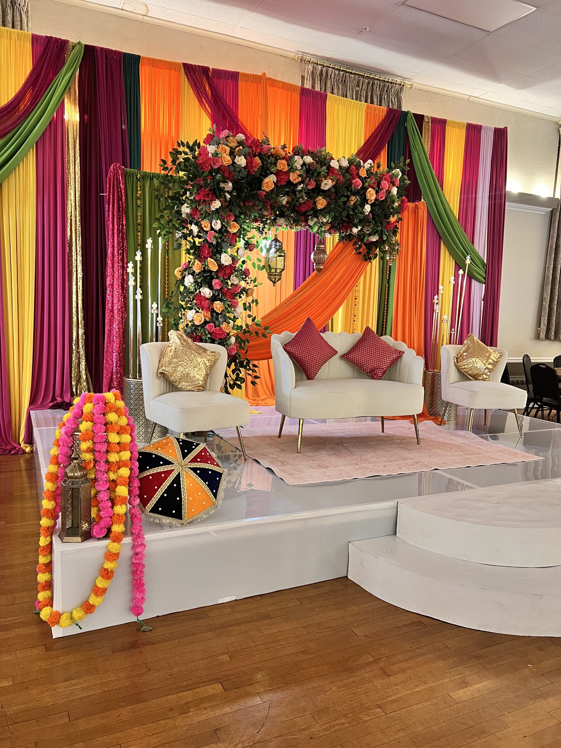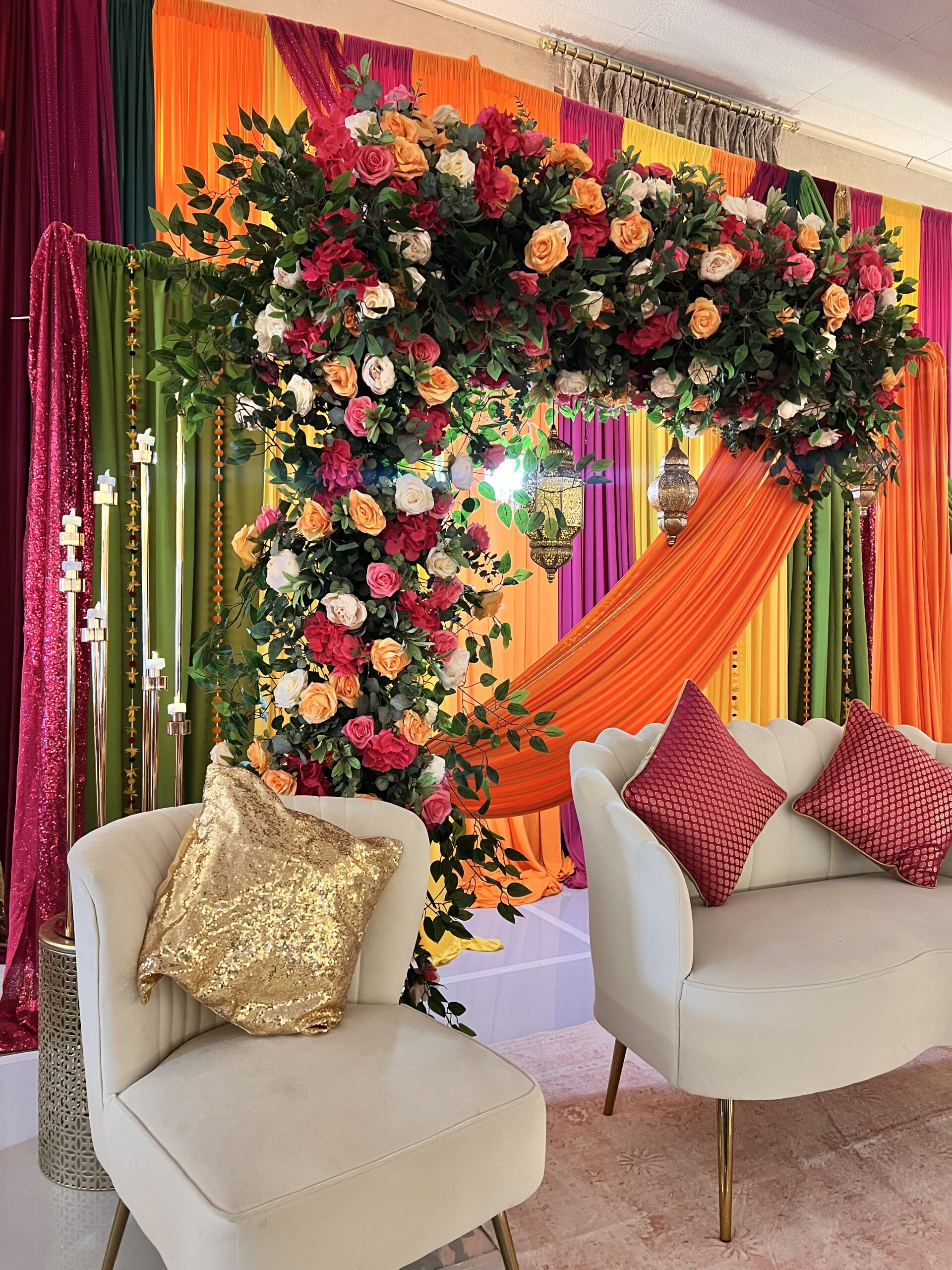 House of Rang is designed for joyful energy—color-heavy drapes, a top floral bar, and curated accents that bring depth without clutter. We tailor the palette to your outfits and venue light so the set feels curated, not chaotic