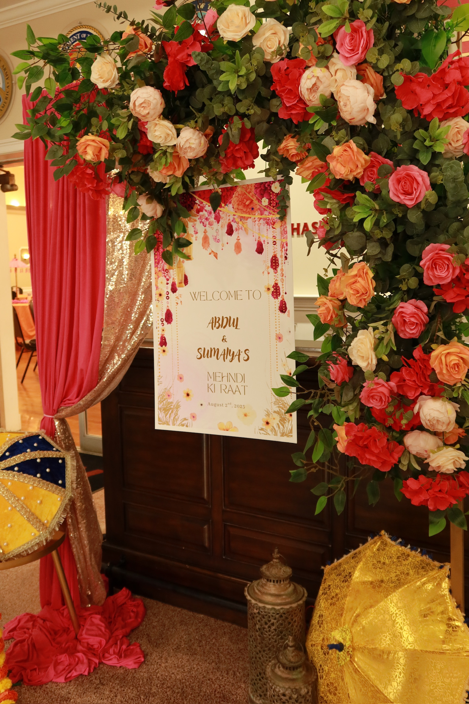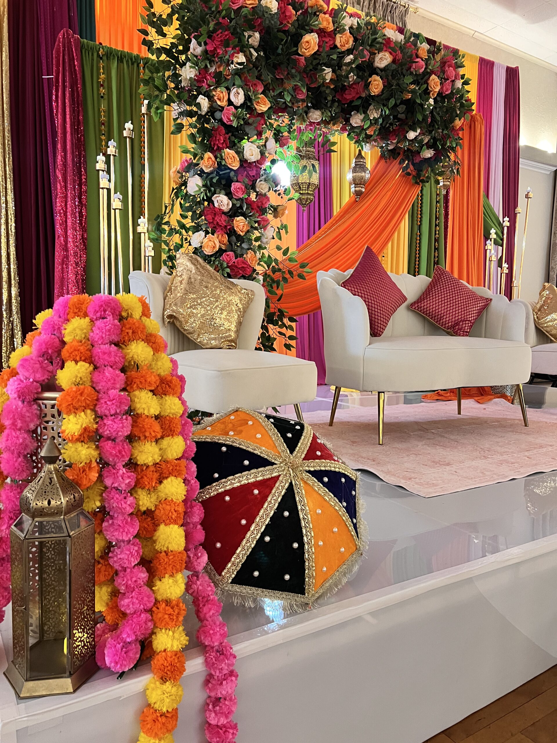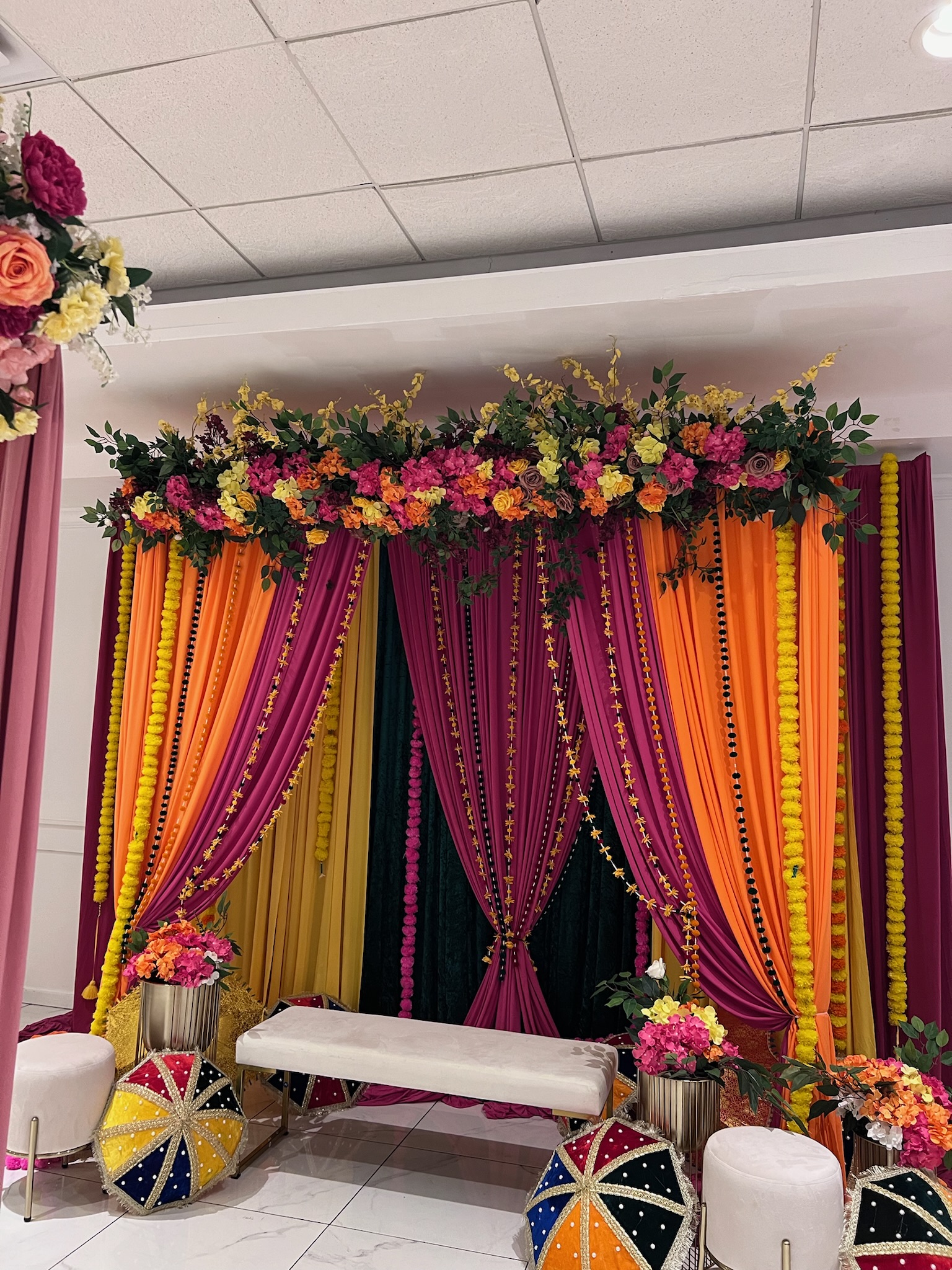 House of Rang is designed for joyful energy—color-heavy drapes, a top floral bar, and curated accents that bring depth without clutter. We tailor the palette to your outfits and venue light so the set feels curated, not chaotic