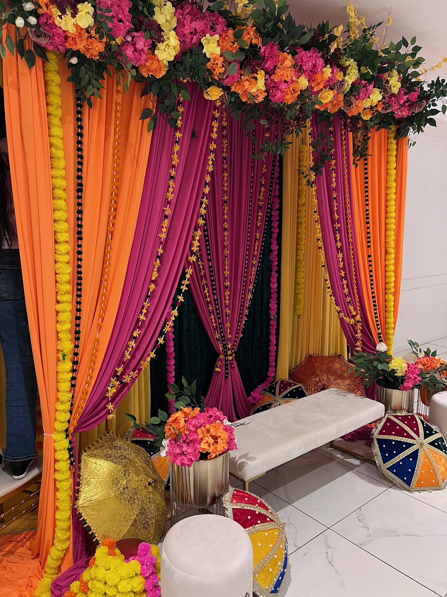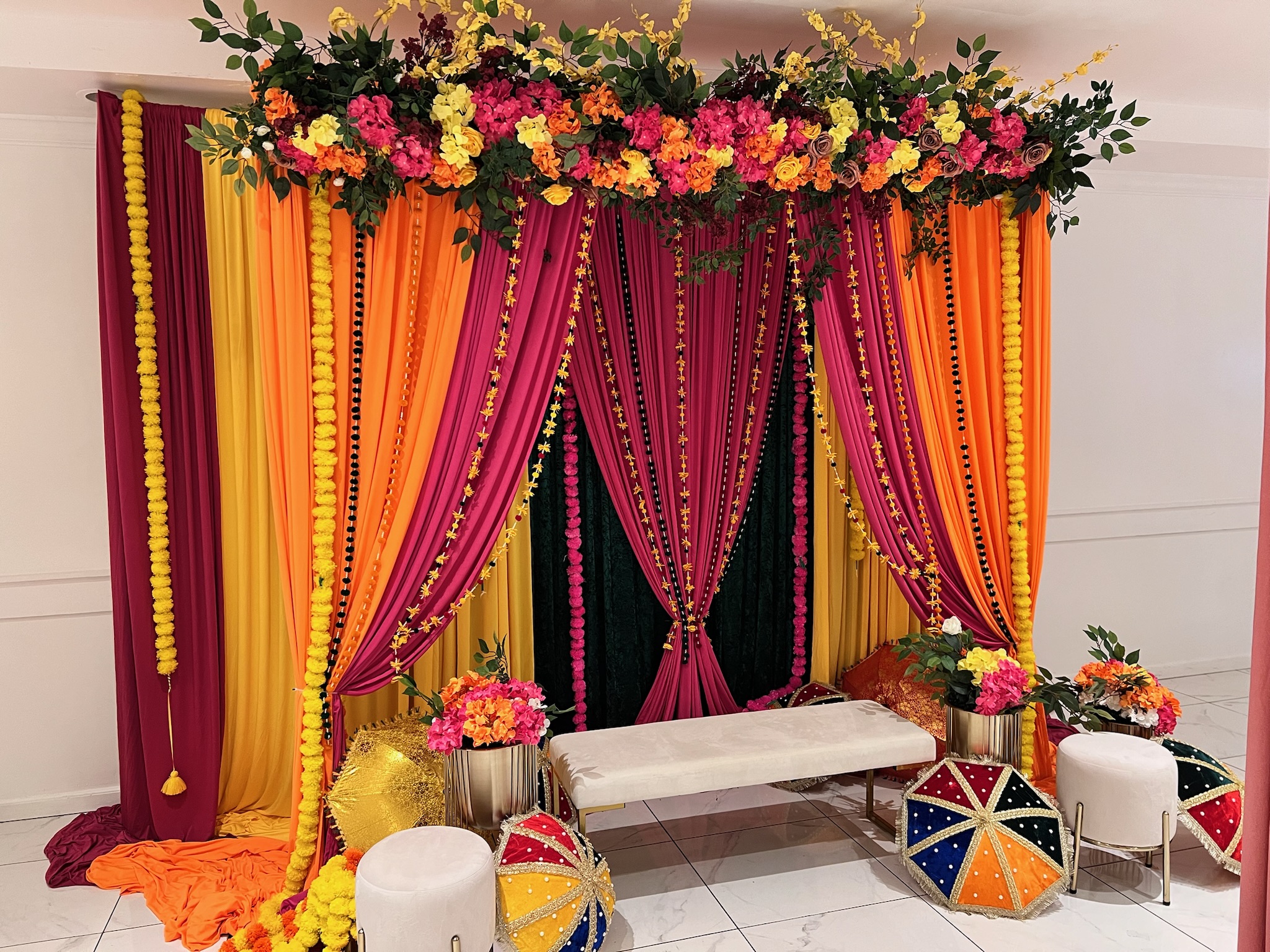 Layered, color-forward draping with a floral bar, coordinated accents, and flexible seating.